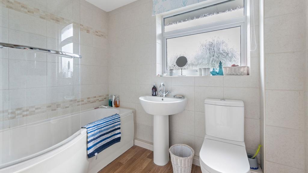 BATHROOM measuring 8’5” x 7’9” - Having an obscured UPVC double-glazed window to the front aspect, a tall modern radiator, comprising of a three-piece white suite, a low-level WC, a hand wash basin with mixer tap over and a p-shaped panel bath with mains-fed shower over with tiles from floor to ceiling within the room.