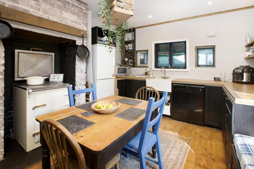 Range of cupboard and drawer base units under wood affect counter tops, sunken butler sink with antique style mixer tap over, plumbing for dishwasher, space for upright fridge freezer, space for table and chairs, brick fireplace with electric Rayburn Ever Hot range, windows to side aspect, sash window overlooking the rear gardens. Double doors through to the…