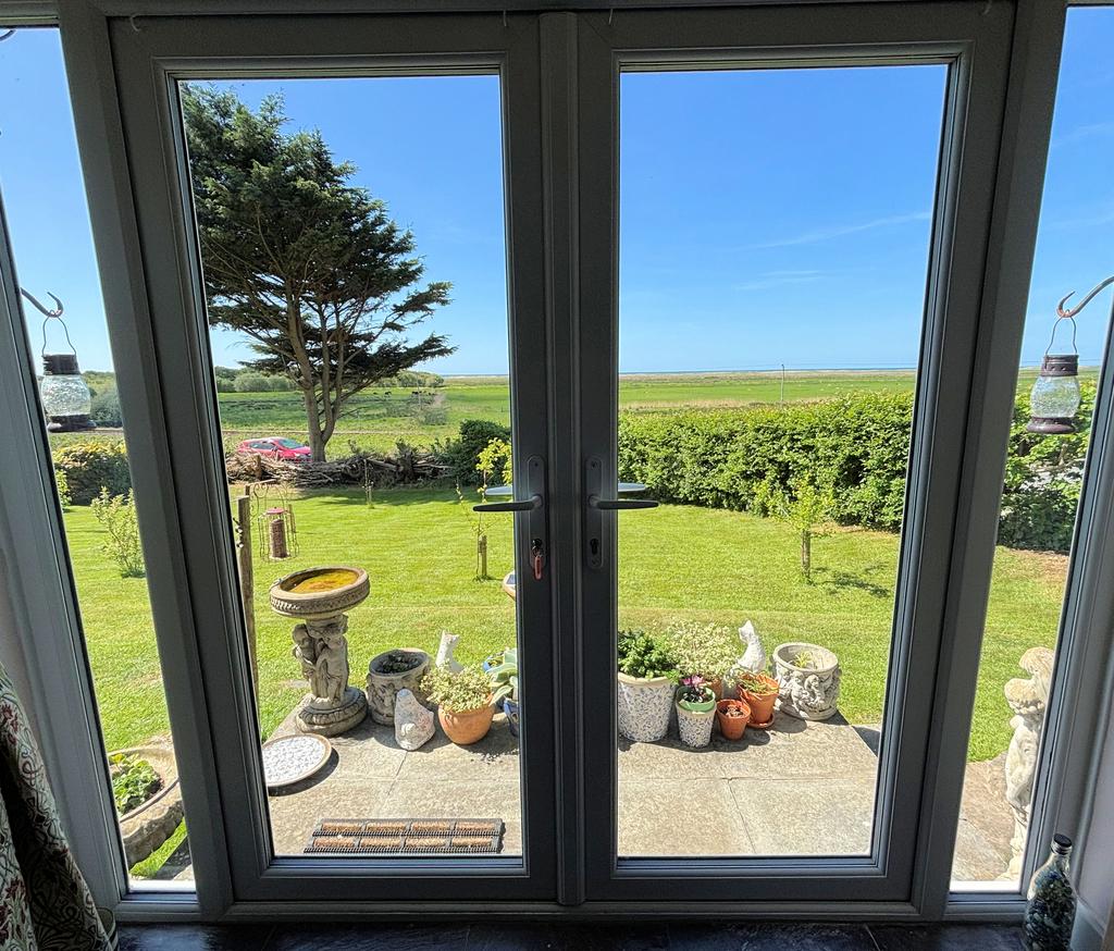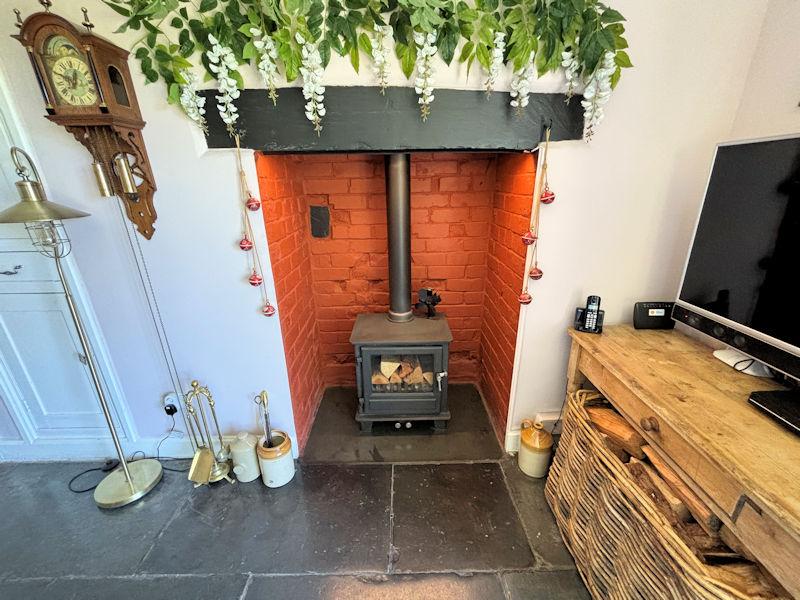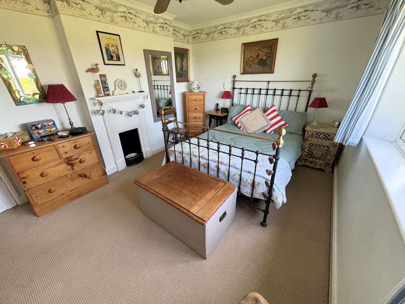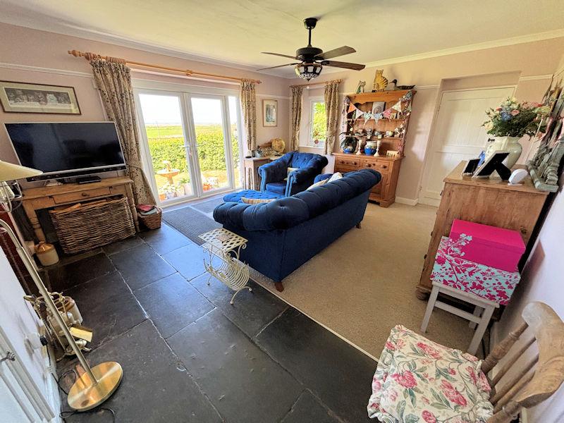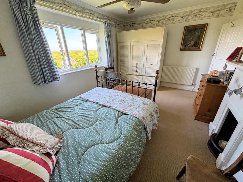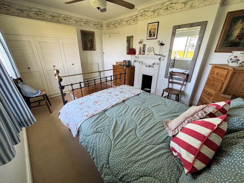 Window to side, French doors to front with distant sea views, built in cupboards, original fireplace with wood burning stove (installed 2023), part timber ( under carpet) part slate flooring, door to;