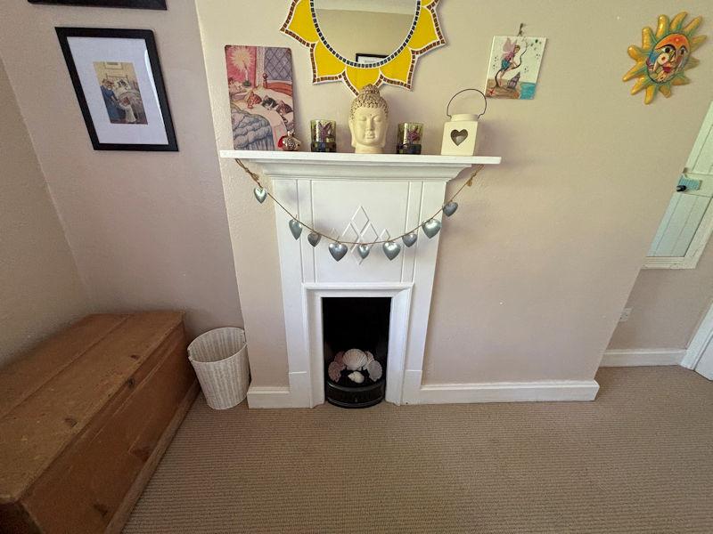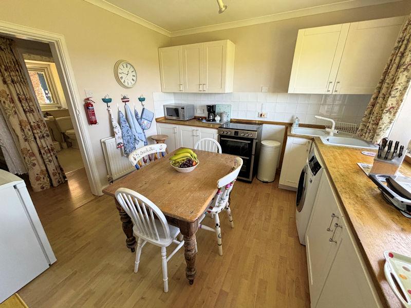 Window to front with distant sea views, laminate floor, white units, wood block work top, double enamel sink, plumbed for washing machine, electric cooker point, original cast iron fireplace.