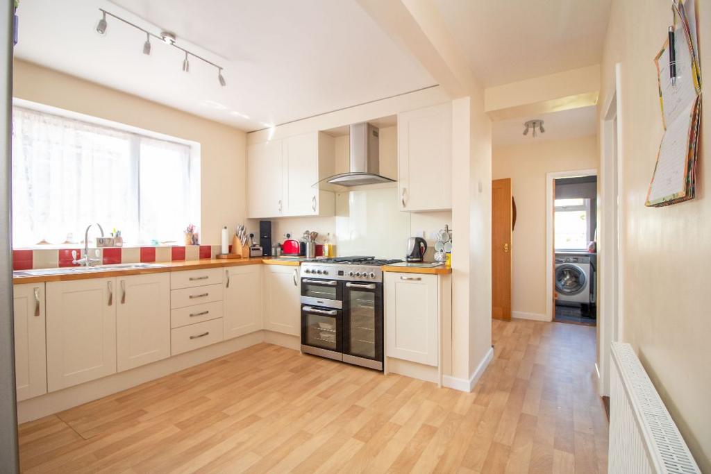 Modern matching range of wall and base units complemented with 'butcher block' style work surfaces over incorporating 1½ bowl sink unit with mixer tap and drainer, space for 'Range' style cooker (to remain) with extractor canopy over, space and plumbing for 'American' style fridge / freezer, cupboard housing domestic and recycling waste bins, wall mounted Worcester boiler for central heating and domestic hot water, tiled to principle areas, luxury vinyl flooring, smoothed ceiling, double glazed window to side aspect.