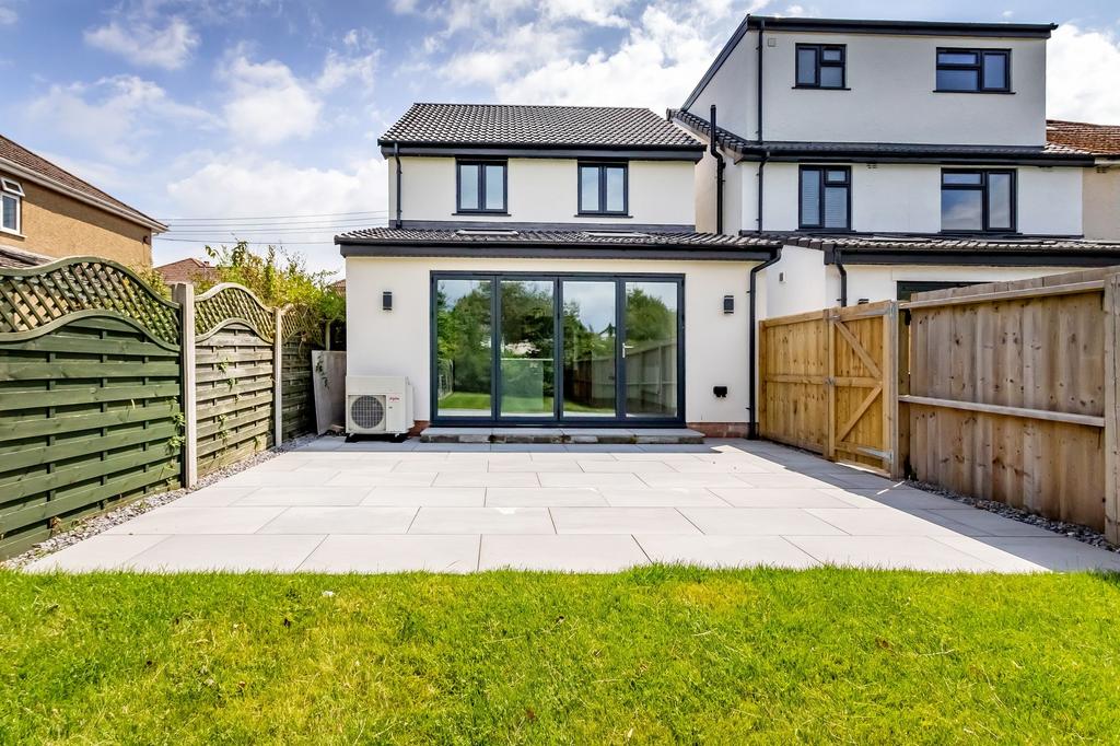 The first floor has three bedrooms, two of which are double bedrooms, and a contemporary family bathroom. The front of the property includes a paved driveway with parking for a couple of cars and side access. The rear garden features a porcelain patio and a lush lawn, enhancing the kitchen and dining area's flowing and airy space.