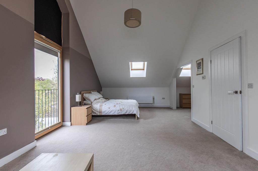 Upstairs, the principal suite is a sanctuary in its own right - cathedral ceilings, a gabled glass wall, and a private balcony offer uninterrupted views across the Fens. Four further bedrooms (one en-suite) are arranged around a generous landing, perfect for family life or visiting guests.