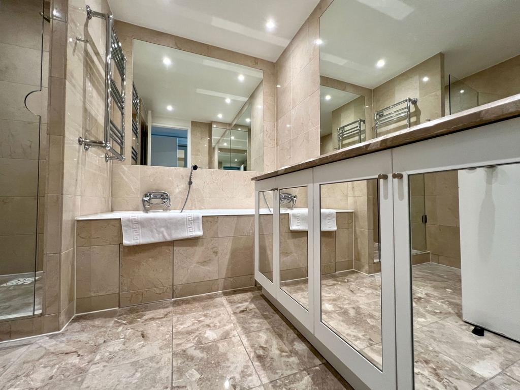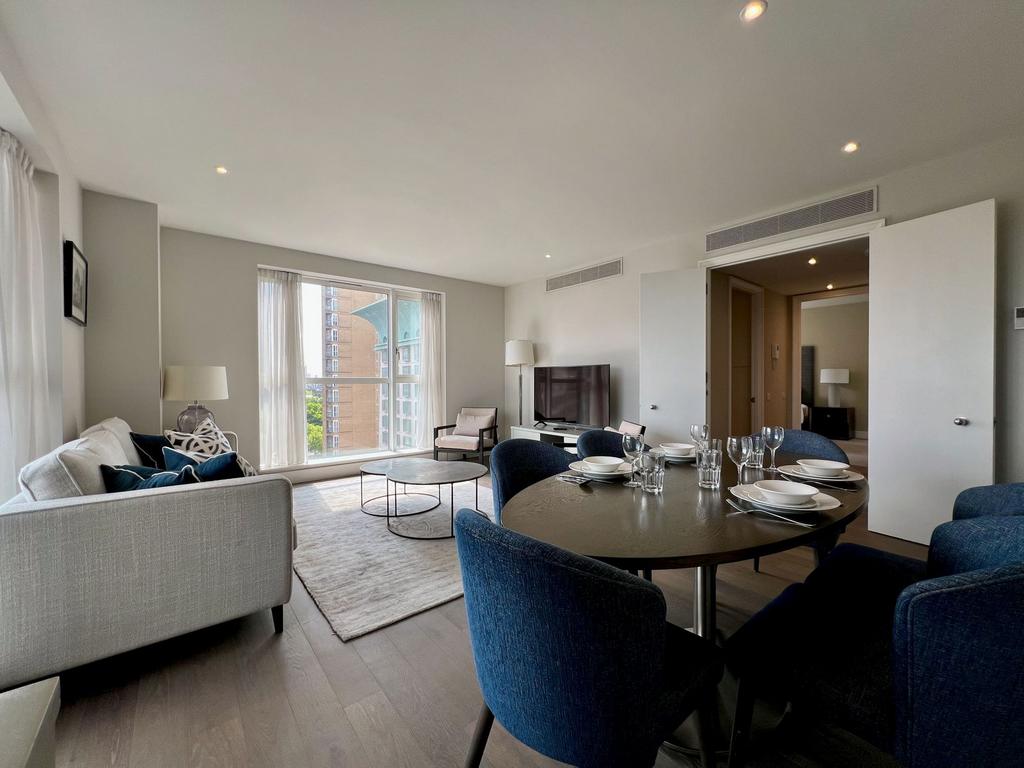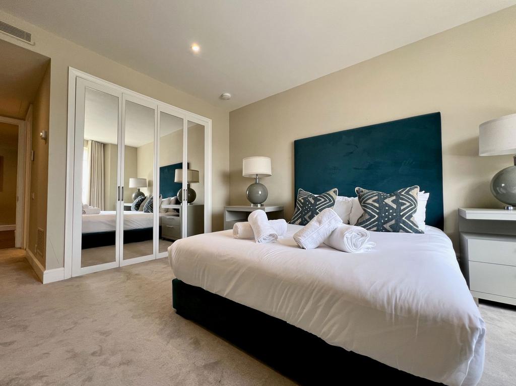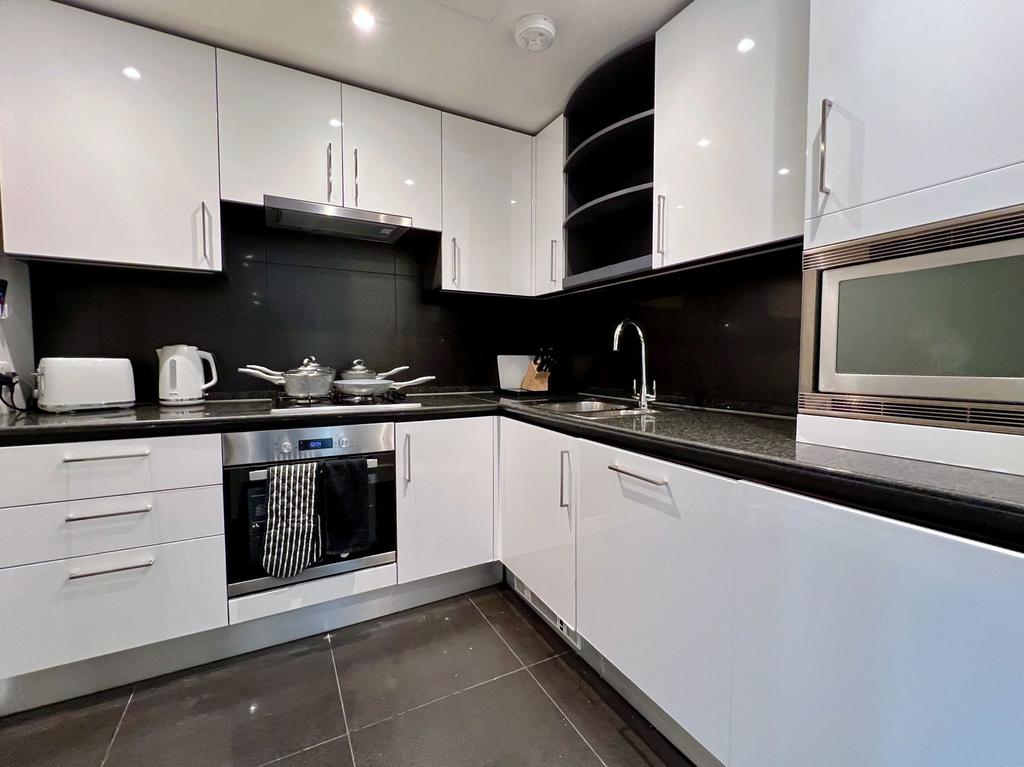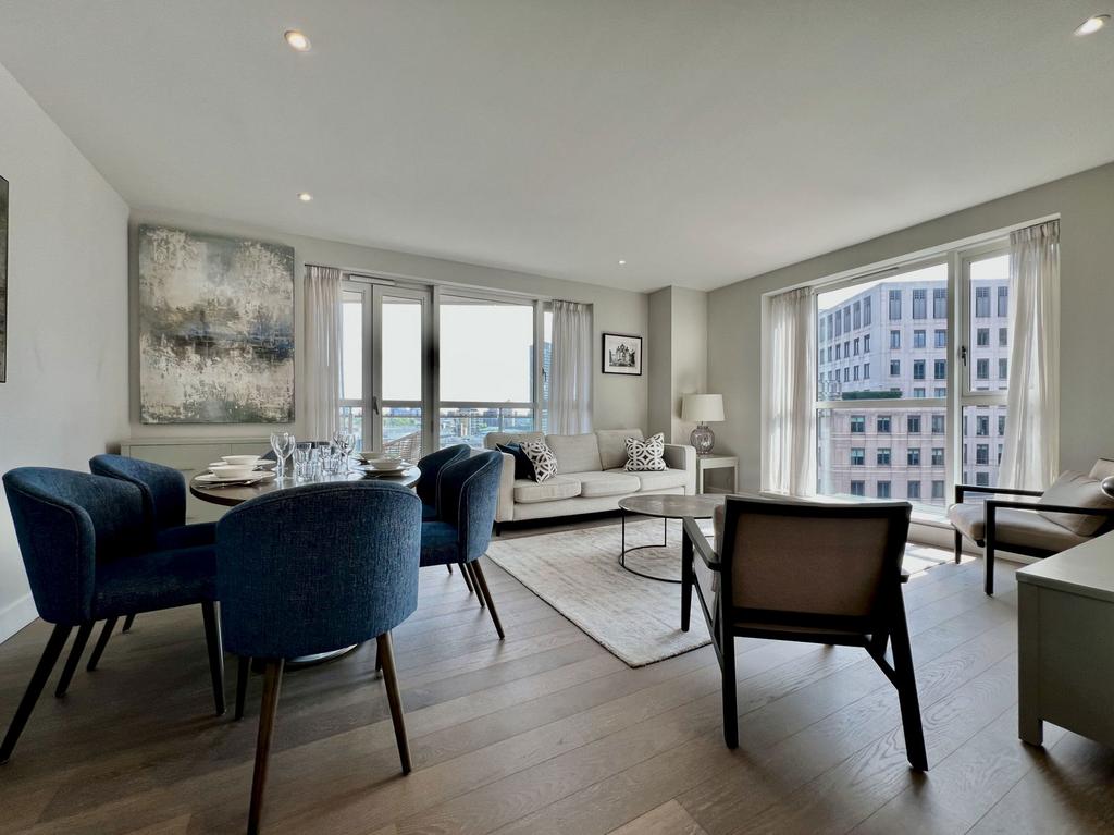 Apartment features an open-plan reception with dining space, wooden floors, floor-to-ceiling windows, with stunning skyline views. The separate kitchen is fully equipped with modern appliances and LED lighting. The bedrooms offer king-size beds, with mirrored, fitted wardrobes.