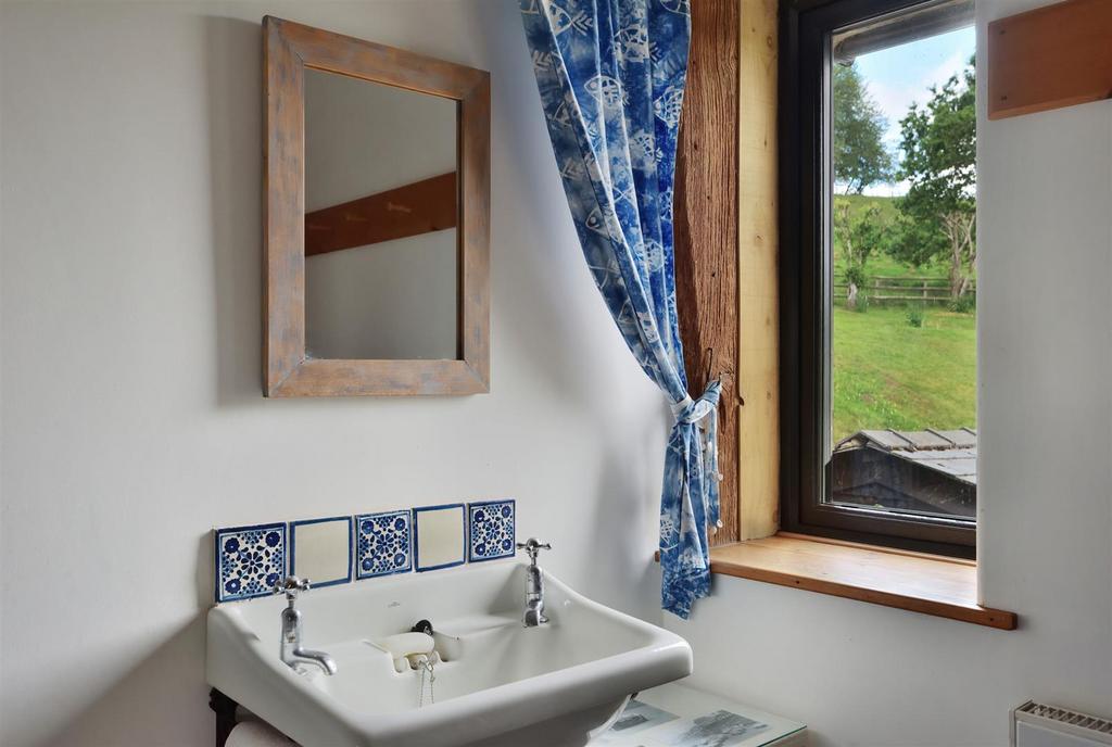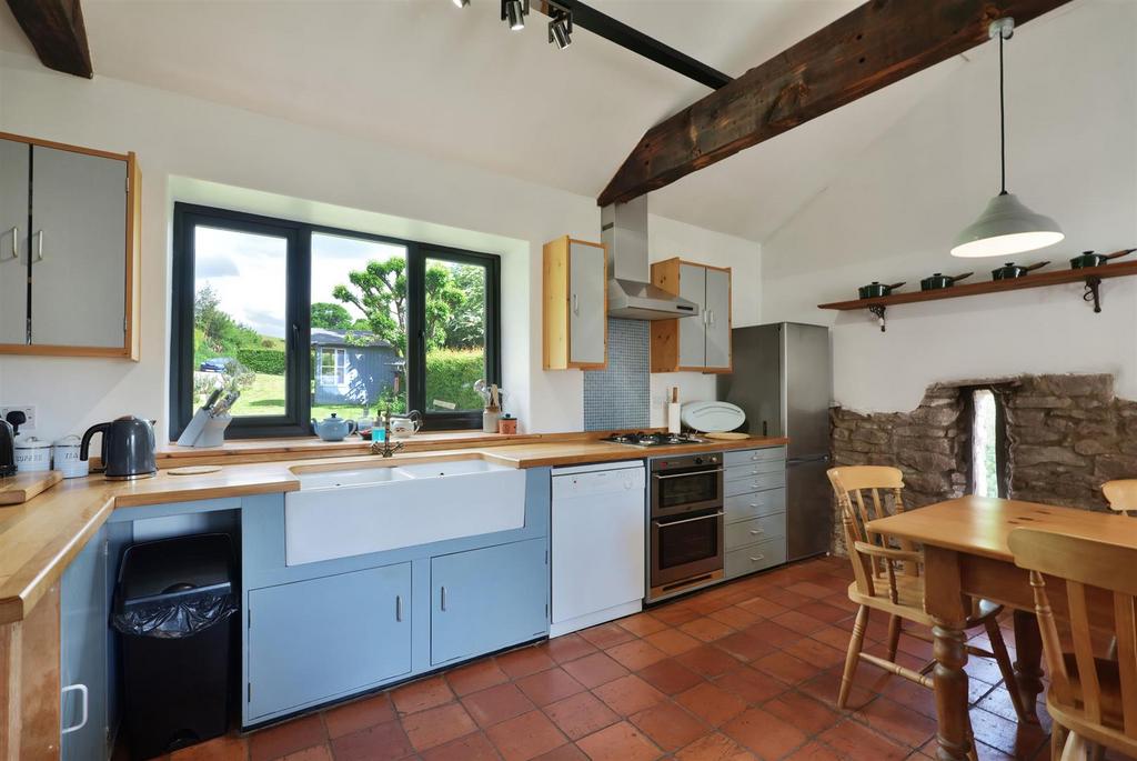 Kitchen - With quarry tiled floor, floor to ceiling brick fireplace with oil stove, ceiling timbers, twin bowl Belfast style sink unit, storage units, oak worksurfaces/splashbacks, electric double oven, 4 ring gas (LPG) hob, radiator, windows to the front and rear and stable door to the rear porch.