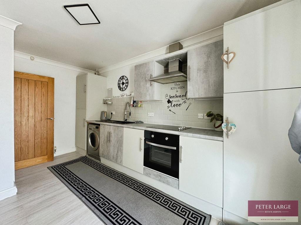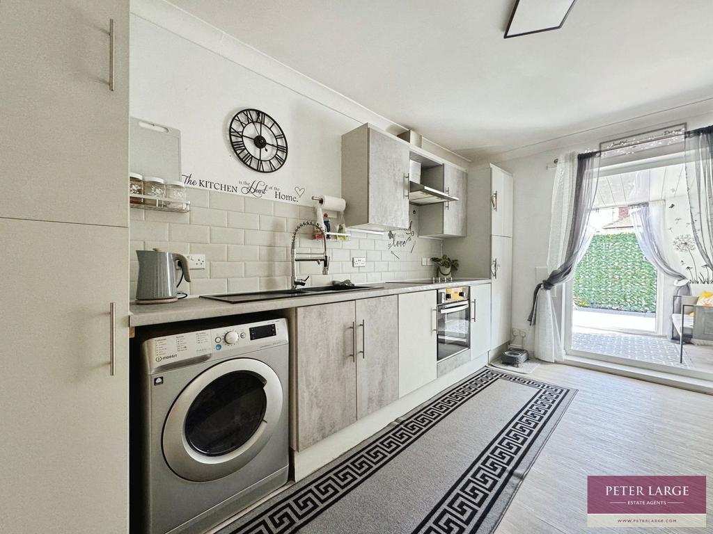 Having an array of modern fitted units comprising wall cupboards, worktop surfaces with drawer and base cupboard beneath, electric oven with four ring halogen hob over and extractor hood above, double drainer sink with flexy mixer tap over, space and plumbing for automatic washing machine, space for American style fridge/freezer, part tiled walls, breakfast bar, laminate floor, coved ceiling, wall cupboard housing the gas meter, larder cupboard housing the 'Ideal' combination boiler which supplies the domestic hot water and radiators. Access to roof space with pull down timber ladder, the loft is a good size being fully boarded with two Velux roof lights, power, light and ample eaves storage. UPVC double glazed French doors giving access into: