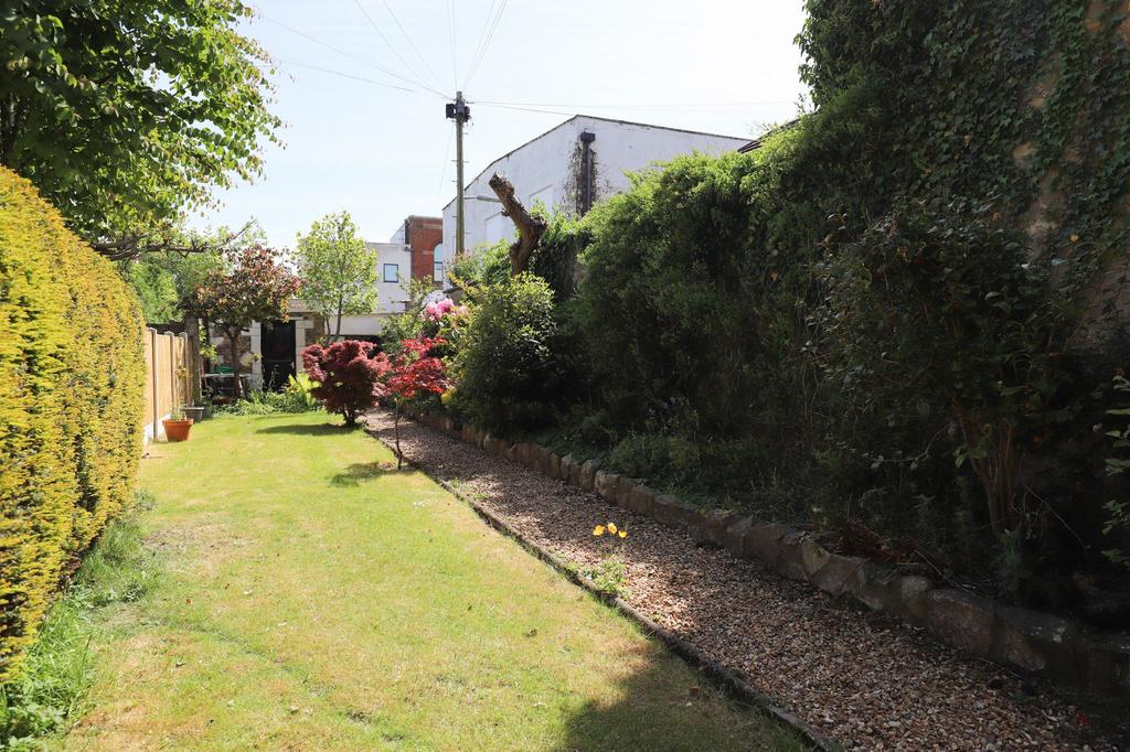 Wrought iron gate leading onto the crazy paved pathway. Laid to flowers borders and hedging.