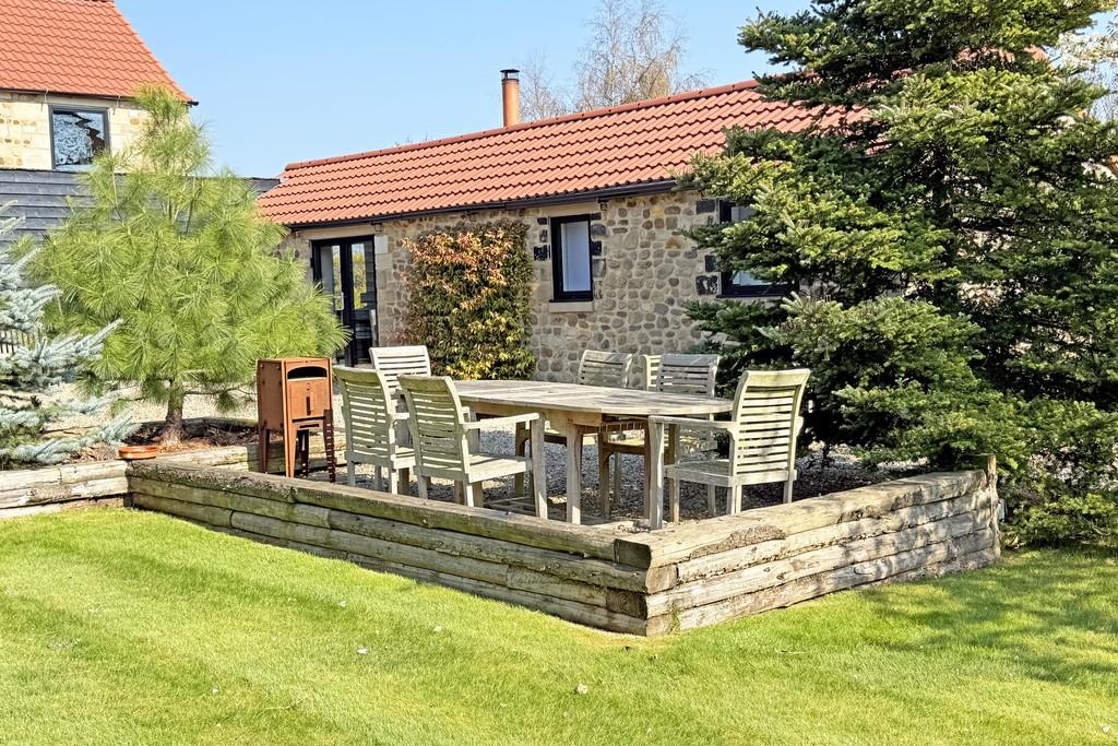 The dining area has delightful views over the adjoining countryside and opens to a sitting room with log-burner.