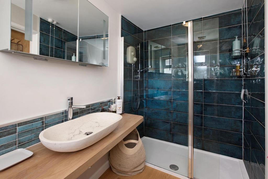 Obscure uPVC double glazed window to rear. Modern suite comprising close coupled WC, large walk-in shower enclosure, inset wash hand basin set onto oak shelf, tiled splash back, wall mounted electric shower, chrome ladder heated towel rail, mirrored vanity unit, extractor fan.