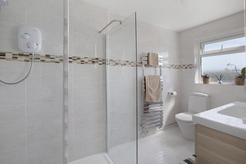 Modern white suite comprising low level WC, inset wash hand basin set into vanity unit, large walk-in shower enclosure with glazed screen, wall mounted electric shower, chrome ladder heated towel rail, mirrored vanity unit, obscure uPVC double glazed window to side, fully tiled walls and floor.