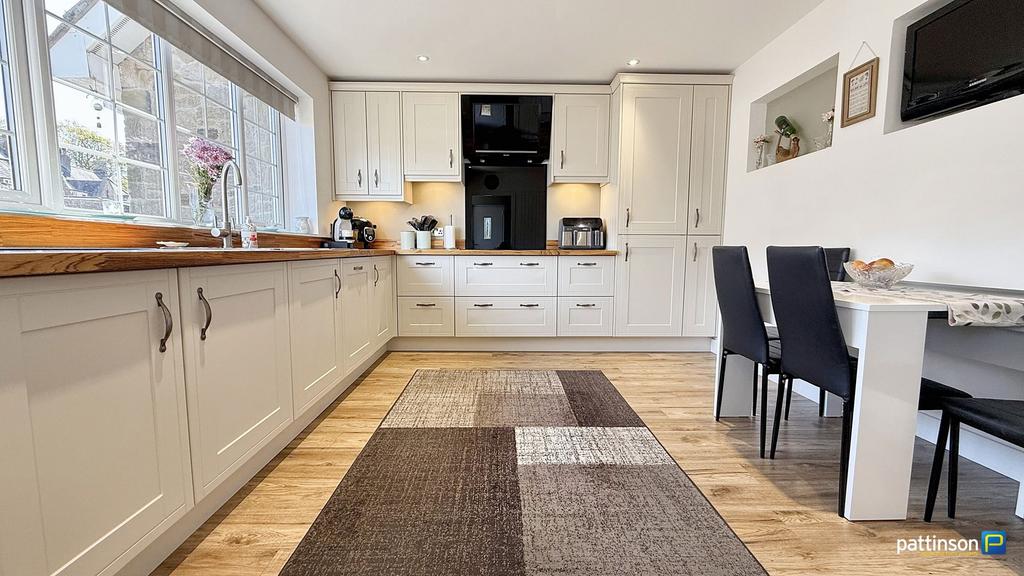 Large window to rear. A contemporary fitted kitchen with a range of shaker style wall, floor and drawer units with solid wood worktops and matching trims, one and a half black glass sink and drainer with mixer tap, integrated five ring electric oven with black glass splashback and slated black glass extractor over, separate integrated double electric oven, integrated larder fridge and dishwasher, inset wall mounted TV, spotlights to ceiling, large white vertical radiator, wood flooring.