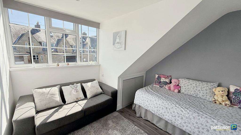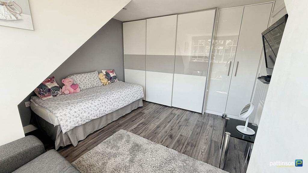 Window to rear. High gloss fitted sliding door triple wardrobe and additional double wardrobe, built in storage into the eaves, wall mounted TV point, wood flooring, radiator.