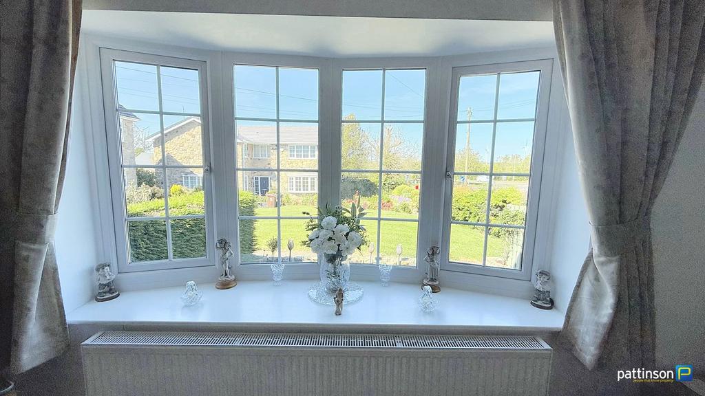 Large bow bay window to front, purpose built fireplace with opti myst log burner effect electric stove, black slate hearth and solid wood mantle, TV point, wood flooring, radiator.
