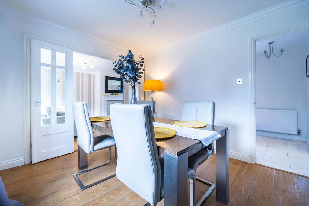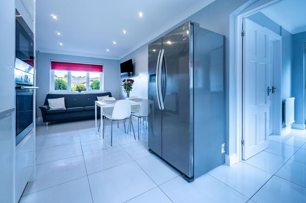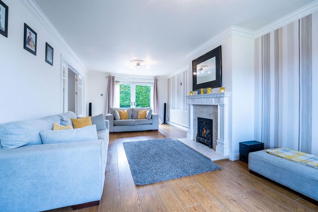The living room is an exceptional space that spans the full length of the house, ideal for both entertaining and quiet family evenings. With a feature fireplace, a large window to the front, and glass French doors opening to the rear patio and garden, this room combines comfort and style with beautiful wood-effect flooring underfoot.