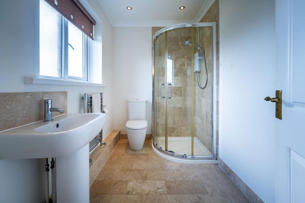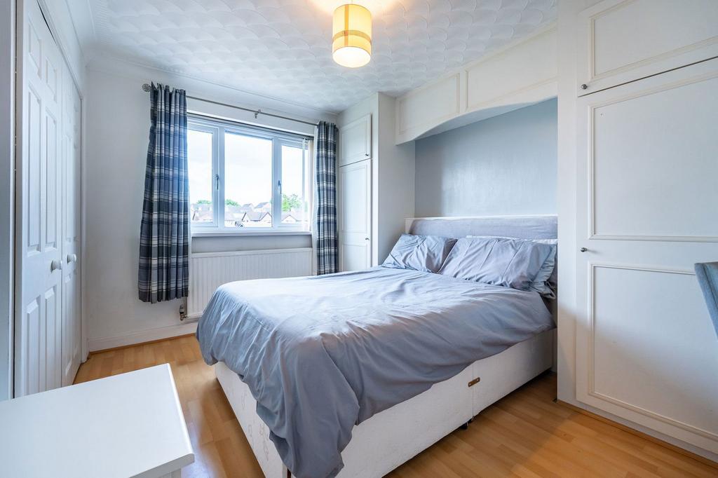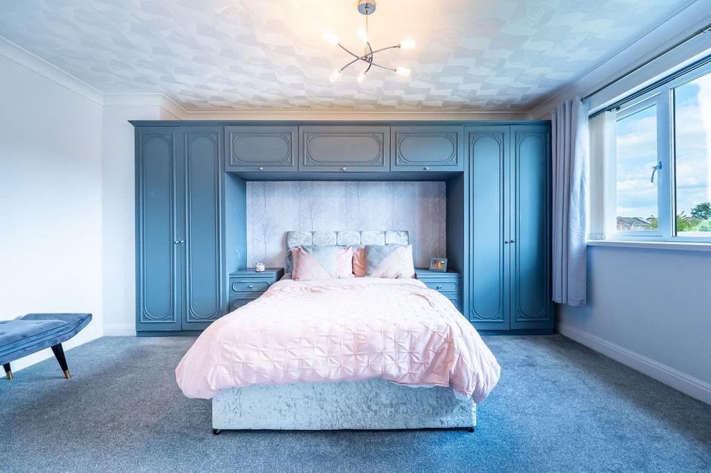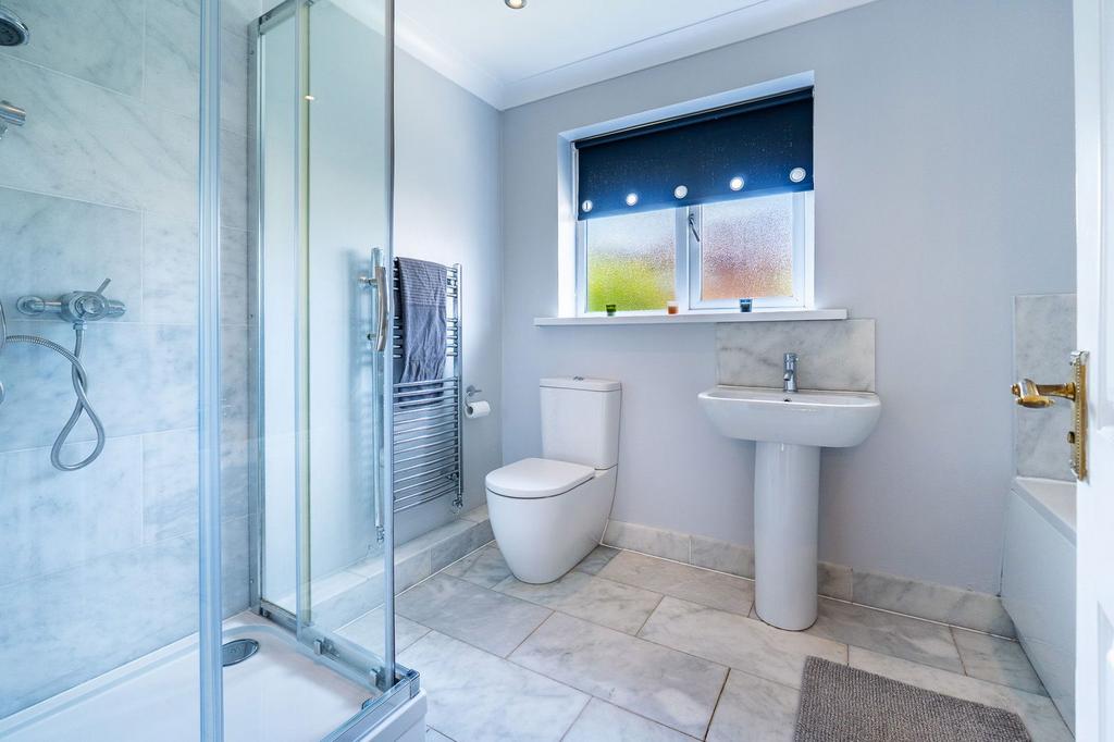 Upstairs, the property continues to impress with a generous landing leading to four substantial double bedrooms, each with large windows that capture views of the landscaped front or rear gardens. All bedrooms feature built-in wardrobes, while the master bedroom stands out for its sheer size, easily accommodating a super king bed. The master also boasts a stylish en-suite bathroom with a spacious walk-in shower.