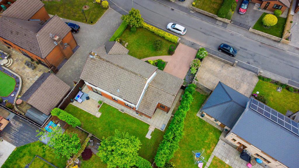 The front of the property is equally attractive, with a mature and manicured garden featuring a lush lawn, colourful flowerbeds, and a shaded seating area. A gated driveway provides ample parking for four or more cars and leads to the spacious double garage.