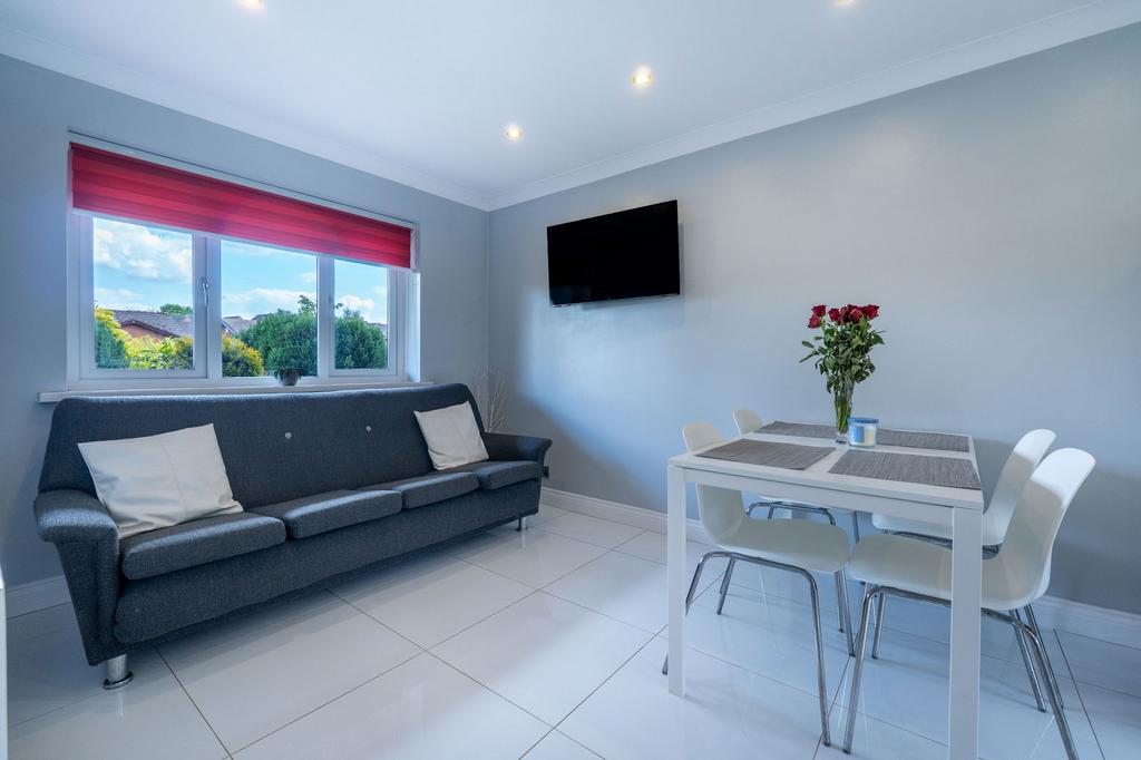 The kitchen is a true showstopper—modern and sleek with high-gloss white cabinetry, ambient floor-level and under-cabinet lighting, quartz worktops, and high-end integrated appliances. It offers plenty of space for an American-style fridge and features a cosy breakfast or secondary dining area, making it the perfect hub of the home.