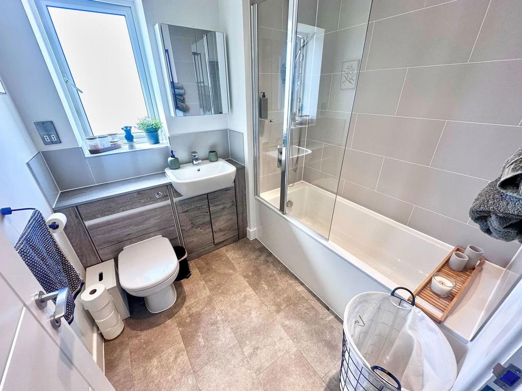W.c. wash hand basin, bath with mixer taps, double glazed window to front, shaver point, extractor fan, part tiling, heated towel rail, inset spotlights.