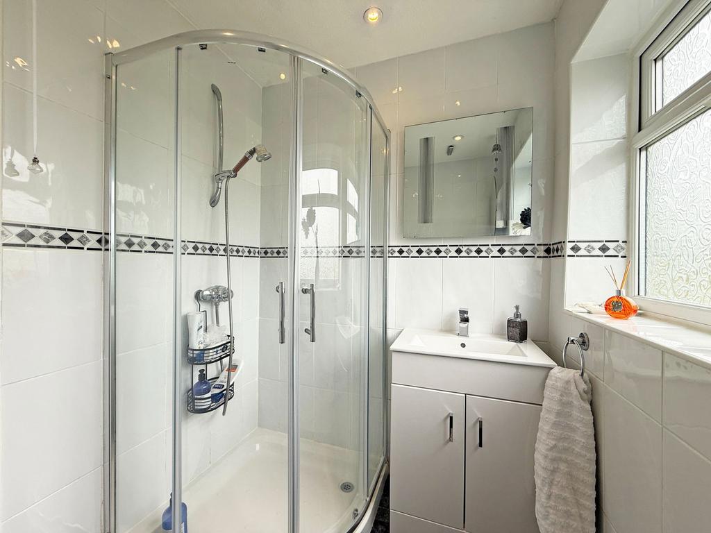 The contemporary family shower room is designed with floor-to-ceiling tiles and hosts a sleek corner shower unit, W/C, and vanity sink unit. The loft is fully insulated and boarded, complete with a pull-down ladder, electrics and houses a regularly serviced combi boiler.
