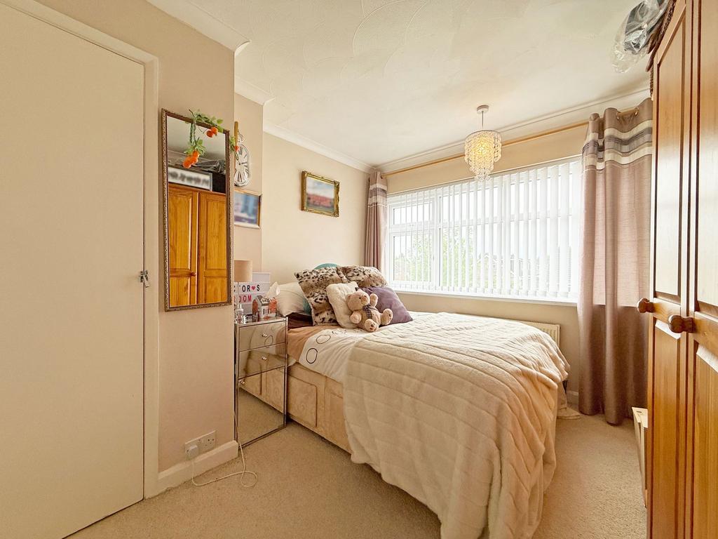 As you approach the property, you'll be greeted by an expansive driveway, garage and a generous front garden. Step through the secure and convenient porch, offering ample space for shoes and coats, and be welcomed into the bright and spacious lounge. The large window floods the room with natural light and showcases the front garden view, while bespoke vertical blinds and a charming feature fireplace with a coal-effect gas fire create a warm and inviting atmosphere.