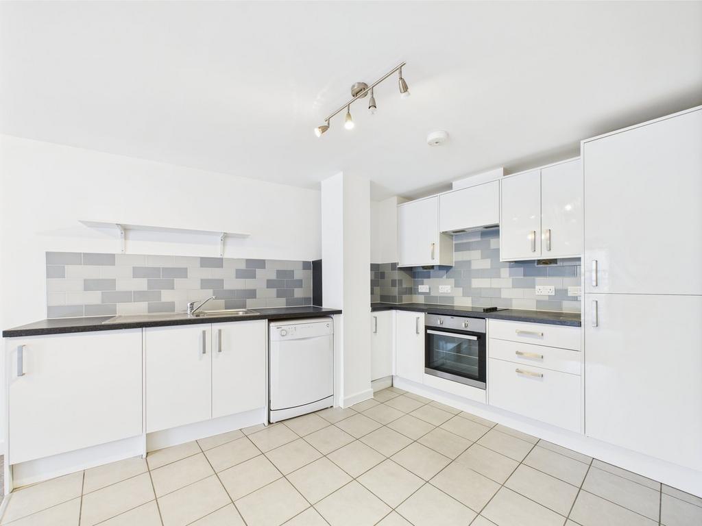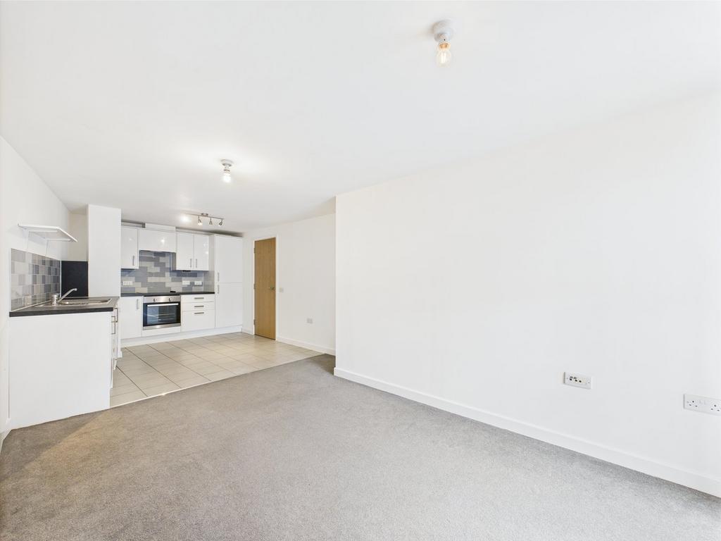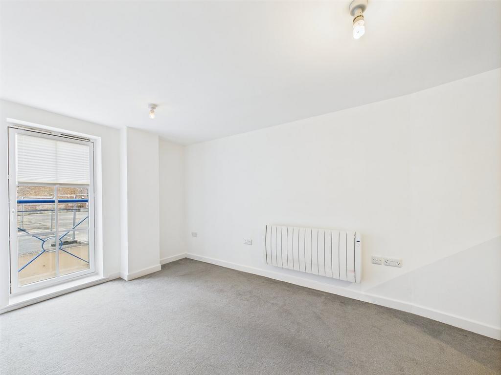 7.44m x 3.38m (24' 5" x 11' 1") The living room/kitchen features a double glazed door to front opening to form a Juliette balcony, electric radiator and carpeted flooring. The kitchen area has high and low level units, stainless steel sink unit inset to roll-edge countertop, integrated fridge-freezer and electric oven with an electric hob inset to countertop and extractor hood over, localised wall tiling and tiled flooring.