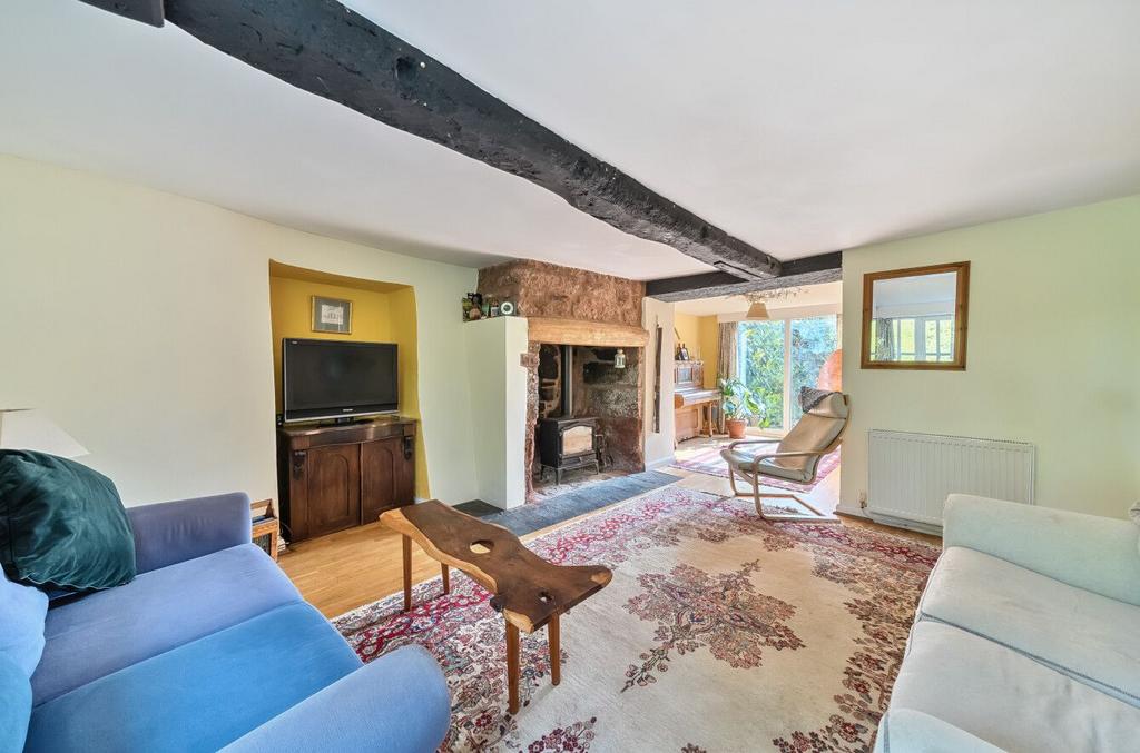 Which has a front double glazed bay window with window seat, original beams, Inglenook fireplace with wood burner, wood flooring, two radiators, rear double glazed sliding doors into the garden. Door into a wc.