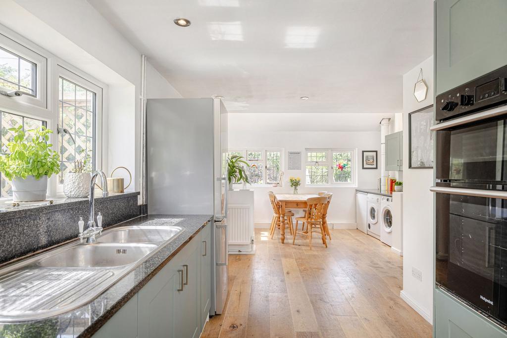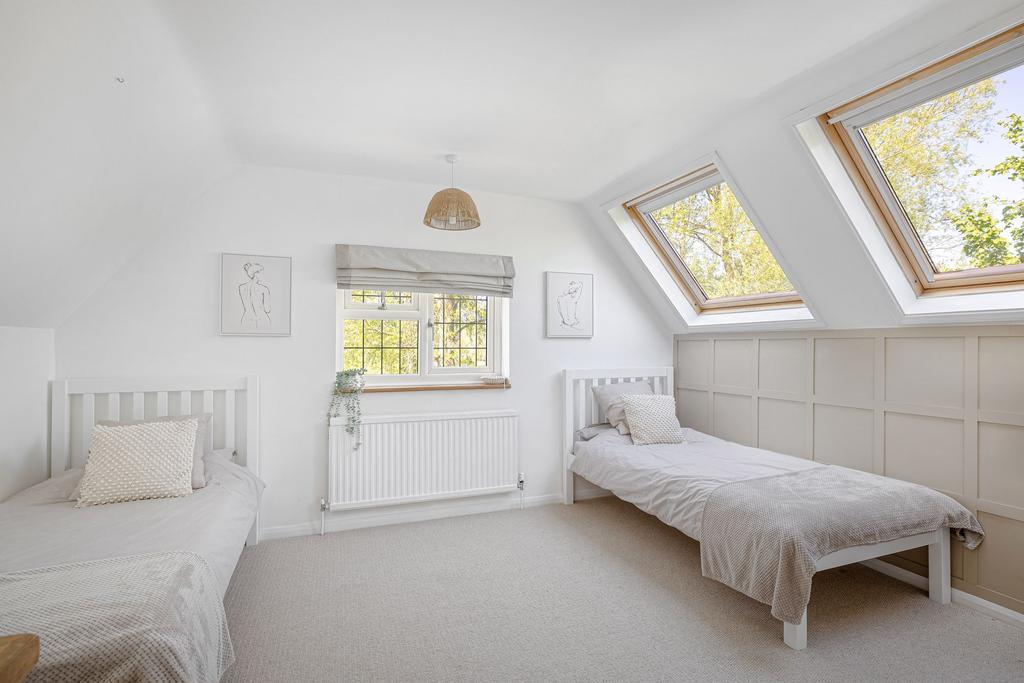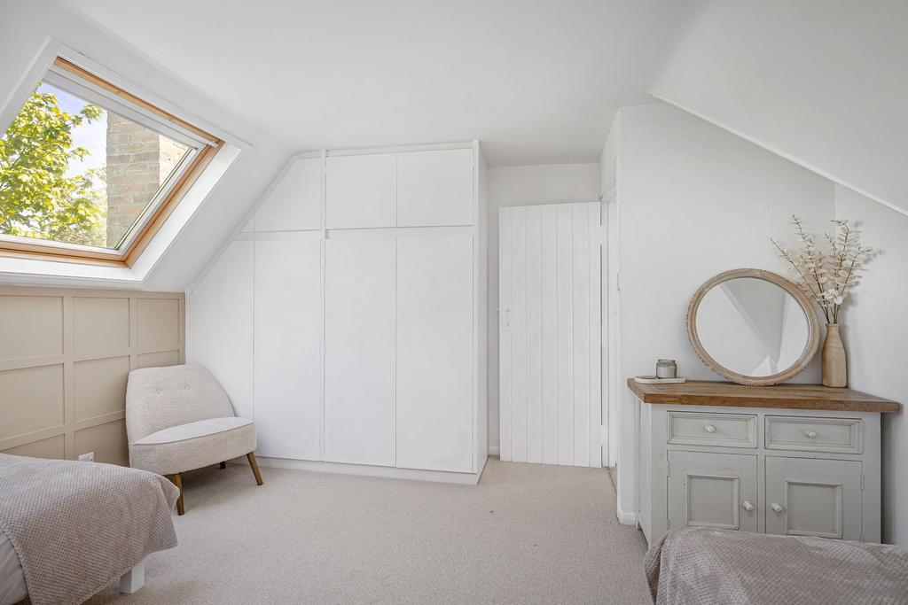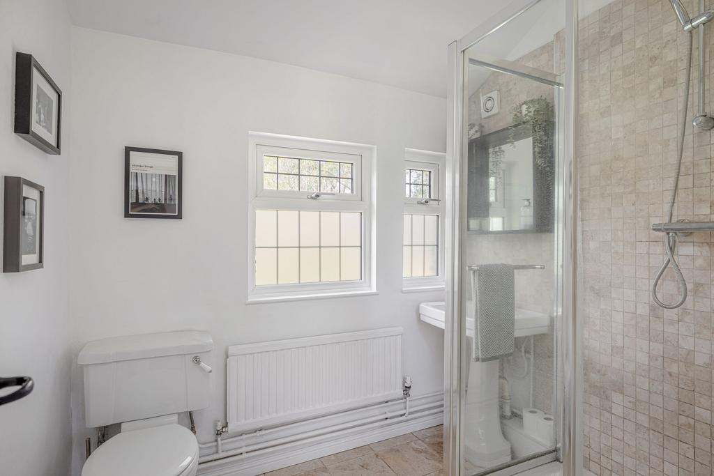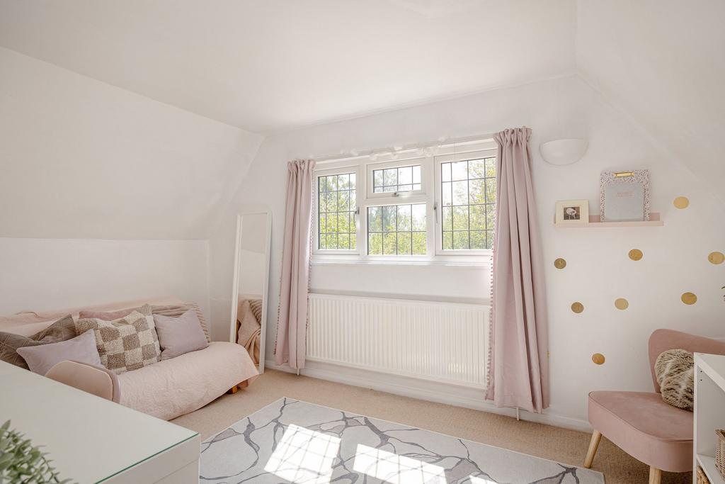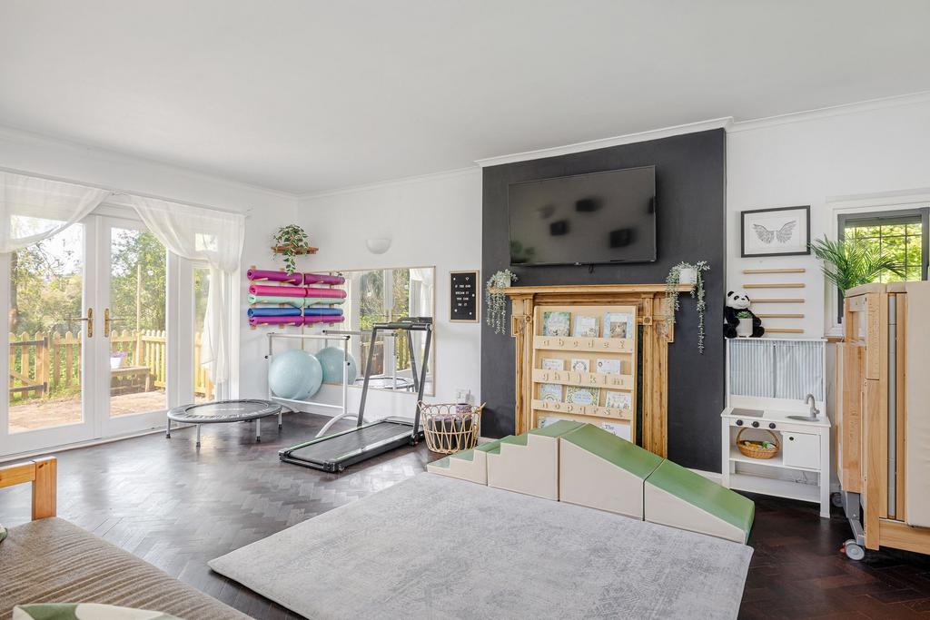 A second reception room, currently used as a playroom and home gym, features French doors opening to the terrace, providing further access to the garden and adding versatility to the layout. Upstairs, four double bedrooms are arranged off a generous landing, each enjoying leafy views. The principal bedroom is calm and neutral, while the other bedrooms offer flexible space for children, guests, or home working. A modern family bathroom and a ground-floor shower room complete the internal layout, providing practical and well-balanced living accommodation.