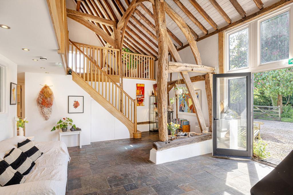 Across the gravel drive sits the detached barn, which was converted in 2012 into a striking, multi-use living space. Original beams soar above an impressive double-height reception room, where natural light pours in through full-height glazed doors. Slate flooring, a freestanding wood burner, and crisp white walls create a stunning contrast with the exposed frame, celebrating the building’s heritage while offering a modern, comfortable space.