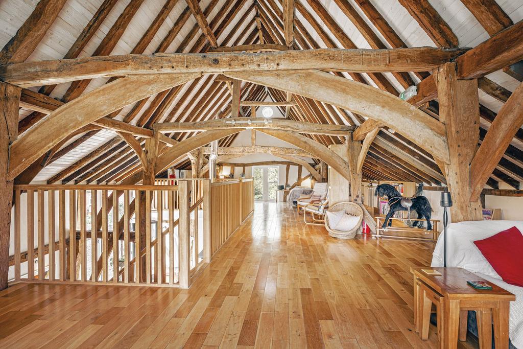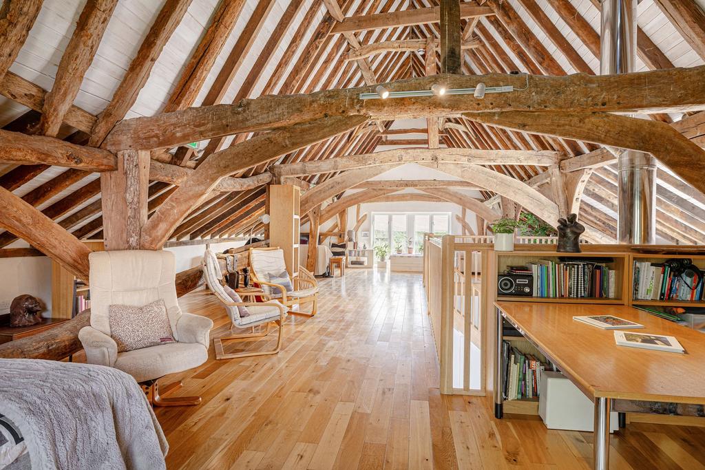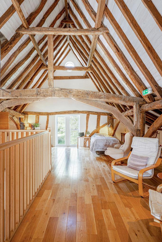 The barn includes three ground-floor bedrooms and two bathrooms, one of which is en suite, offering the possibility to create a self-contained annexe or apartment. A fully fitted kitchen/living area and a vast open-plan mezzanine with vaulted ceilings provide an ideal space for lounging, working, or hosting gatherings, with the potential to create private rooms if needed. Whether used as guest accommodation, a holiday let, a workspace, or a creative retreat, the barn’s flexibility is outstanding.