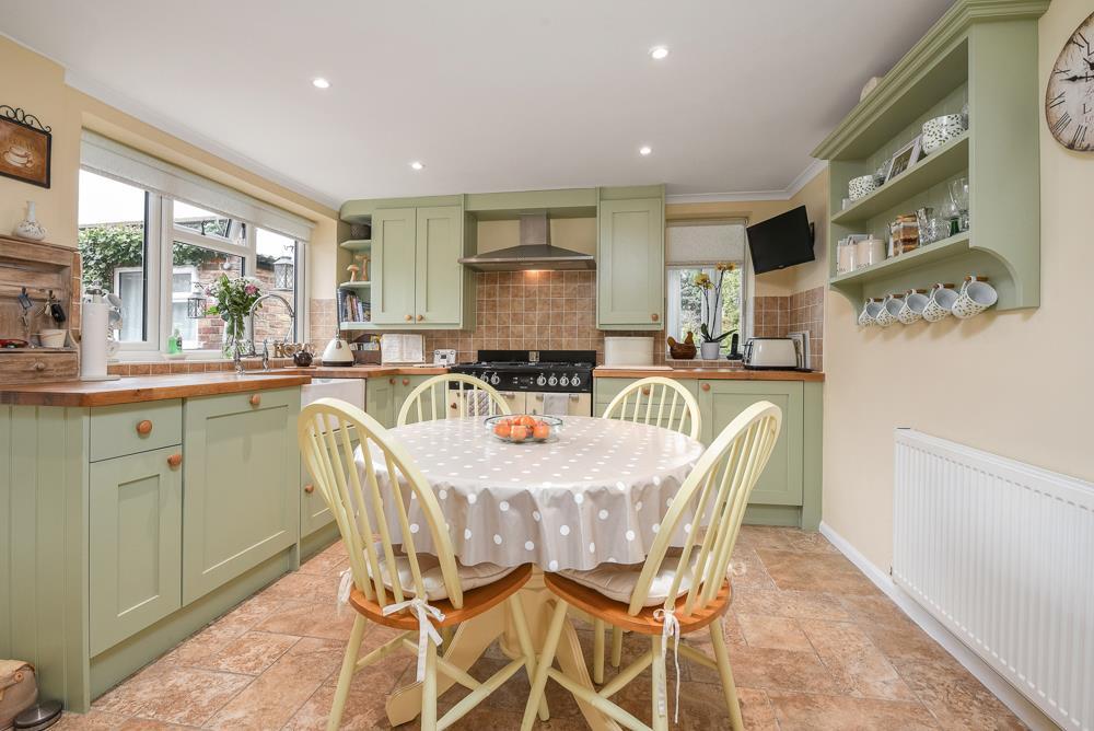 Dining Kitchen - 3.33m x 3.25m (10'11 x 10'8) - A light and airy space benefitting from a dual aspect and having been modernised with a generous range of hand made wall, base and drawer units with hand painted fronts, oak preparation surfaces, under mounted Belfast sink, tiled splashbacks, space for free standing gas or electric range, integral dishwasher, central heating radiator, integrated under counter fridge, ample room for small dining table, inset downlighters to the ceiling, double glazed windows to the rear and side elevations and cottage latch door leading through into: