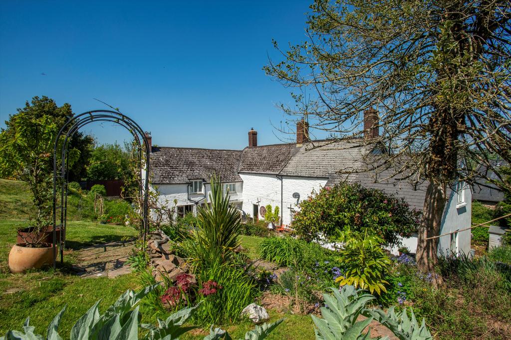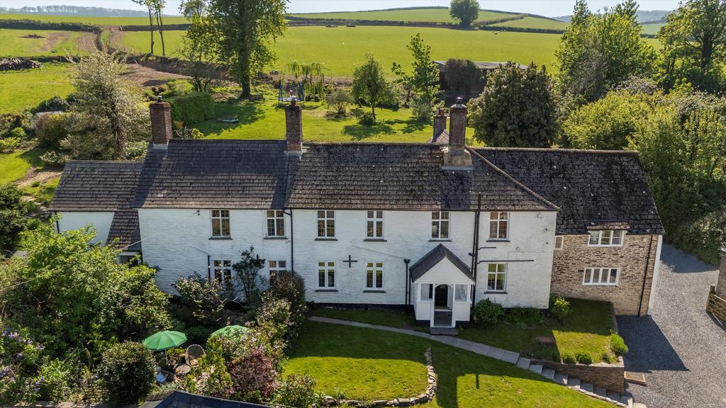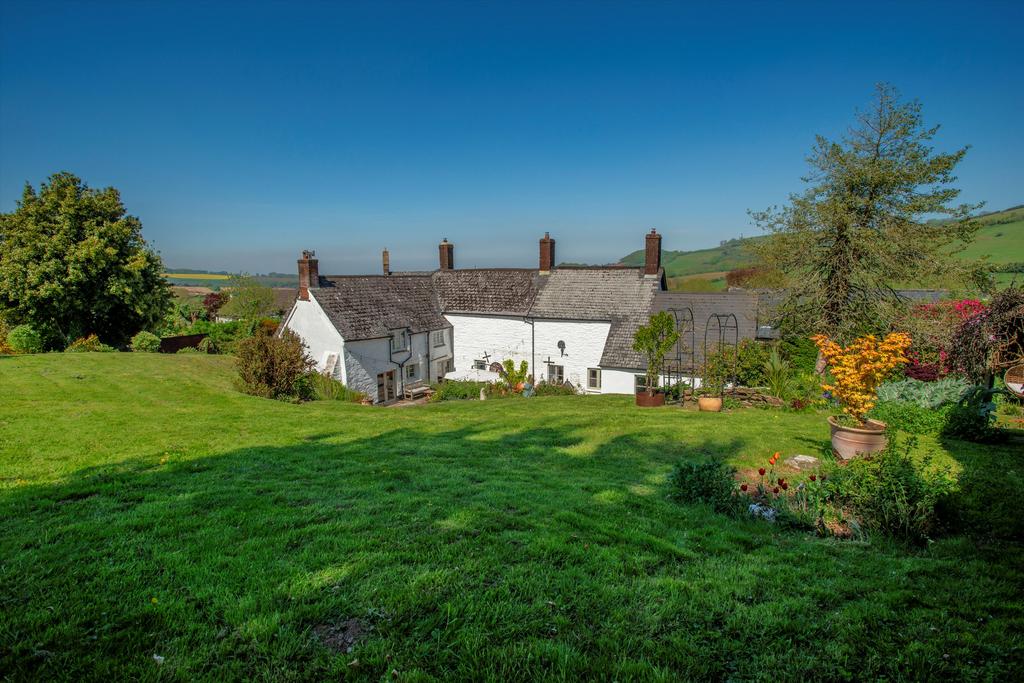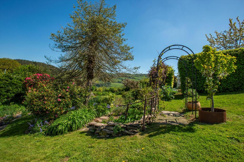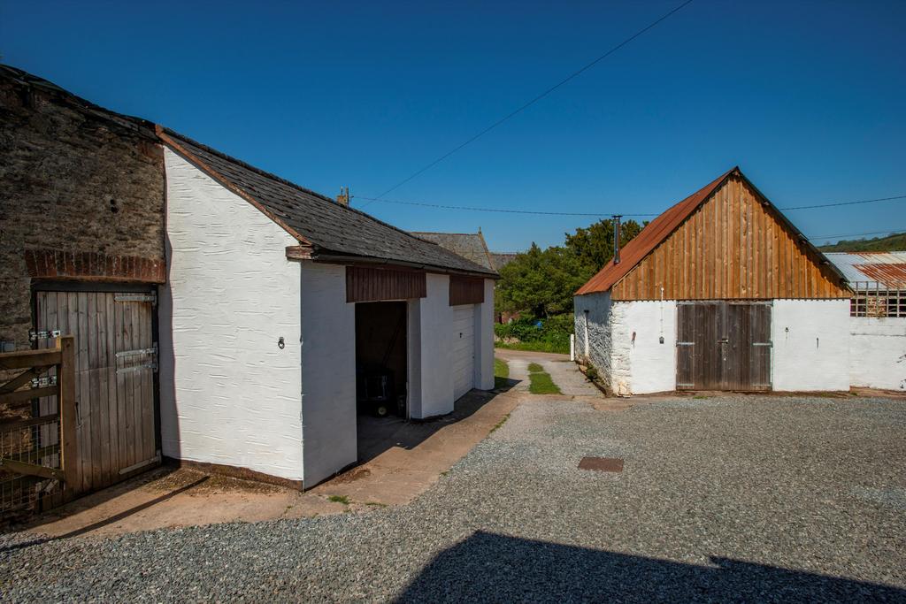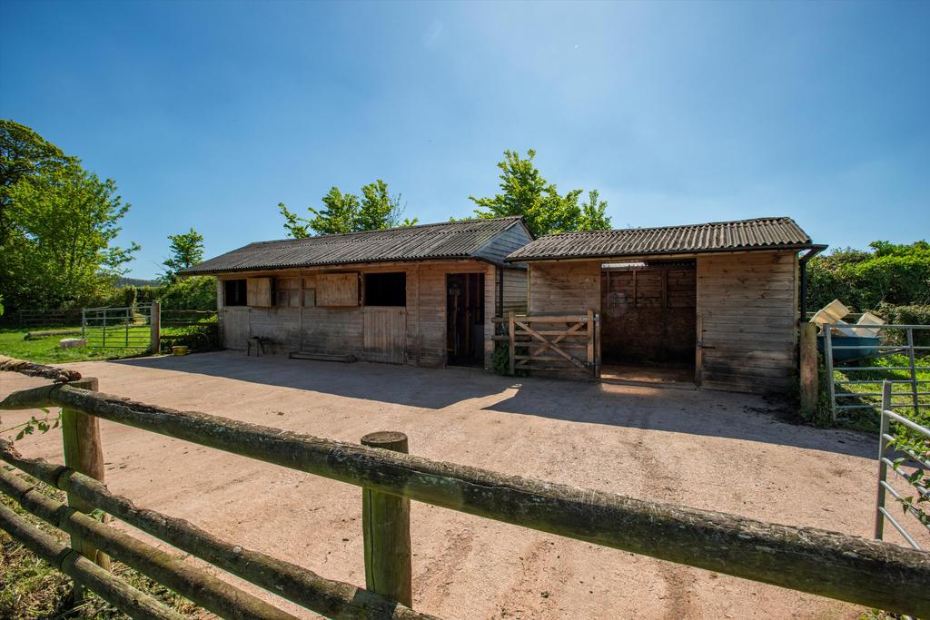 The house fronts onto a raised lawn beside a parking area for several cars, two garages with attached workshop and an impressive barn which has planning permission for conversion. Most of the garden and the pasture lies behind the house, where steps from a two-level, paved terrace rise to a sloping lawn dotted with mature trees and shrubs, and an vegetable garden. From the top of the garden there are breathtaking views across Exmoor extending on a clear day to Wales. Beyond the garden is an area of fenced pasture divided into three along with a good sized stable block, perfect for equestrian enthusiasts.
