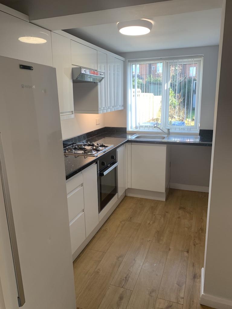 The kitchen is equipped with modern wall and base units for storage, along with space for a fridge/freezer.
