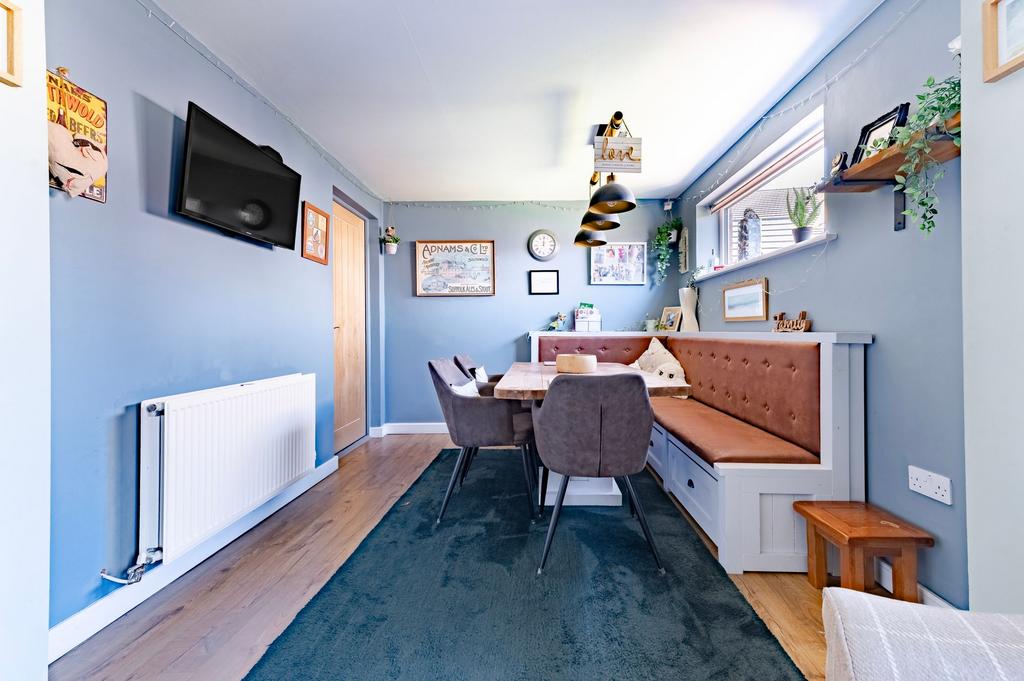 In the centre of the home, you’ll find an internal hallway where you’ll find a handy storage cupboard, perfect for everyday essentials, and a well-positioned WC offering practicality for the family. The large kitchen-diner, featuring fitted cabinetry and ample space for appliances. The dining area is perfect for family meals, with patio doors opening to the rear garden, blending indoor and outdoor living effortlessly.