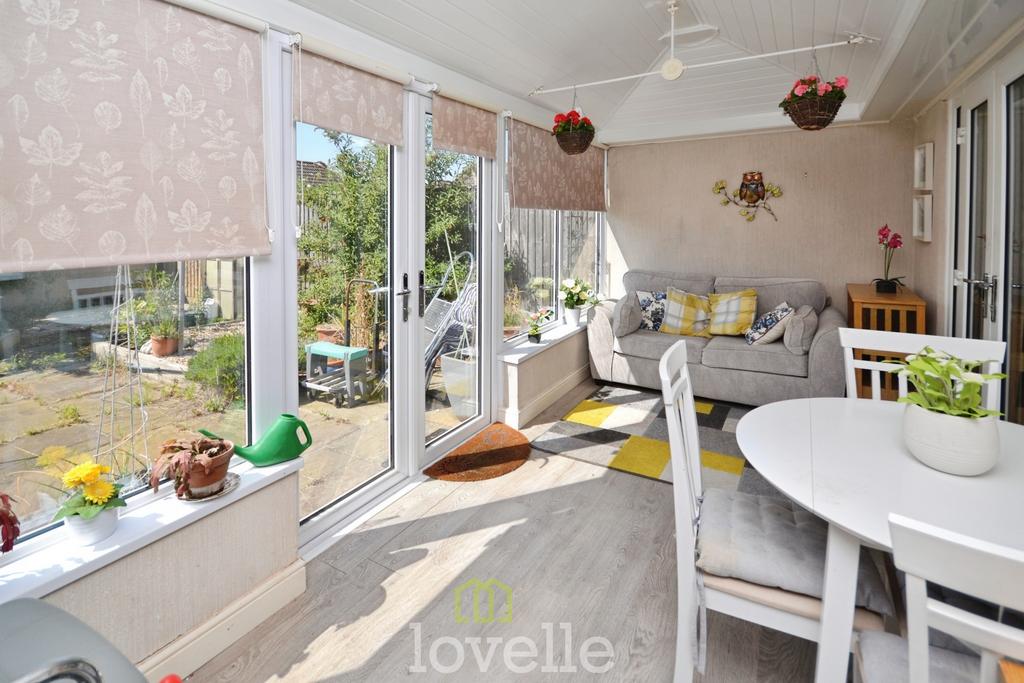 The modern shower room includes a WC, pedestal wash hand basin, and a disability-access bath with shower over. The sunroom spans the rear of the property and enjoys views over the west-facing garden, which is paved for ease of maintenance and features raised flower borders filled with a variety of plants and shrubs.