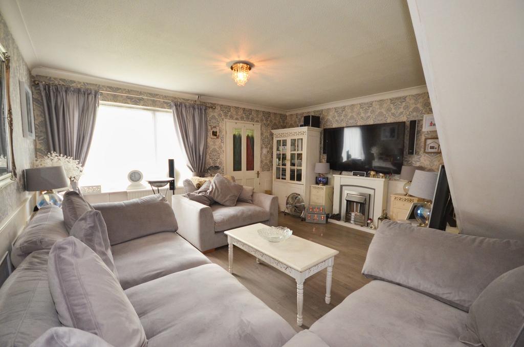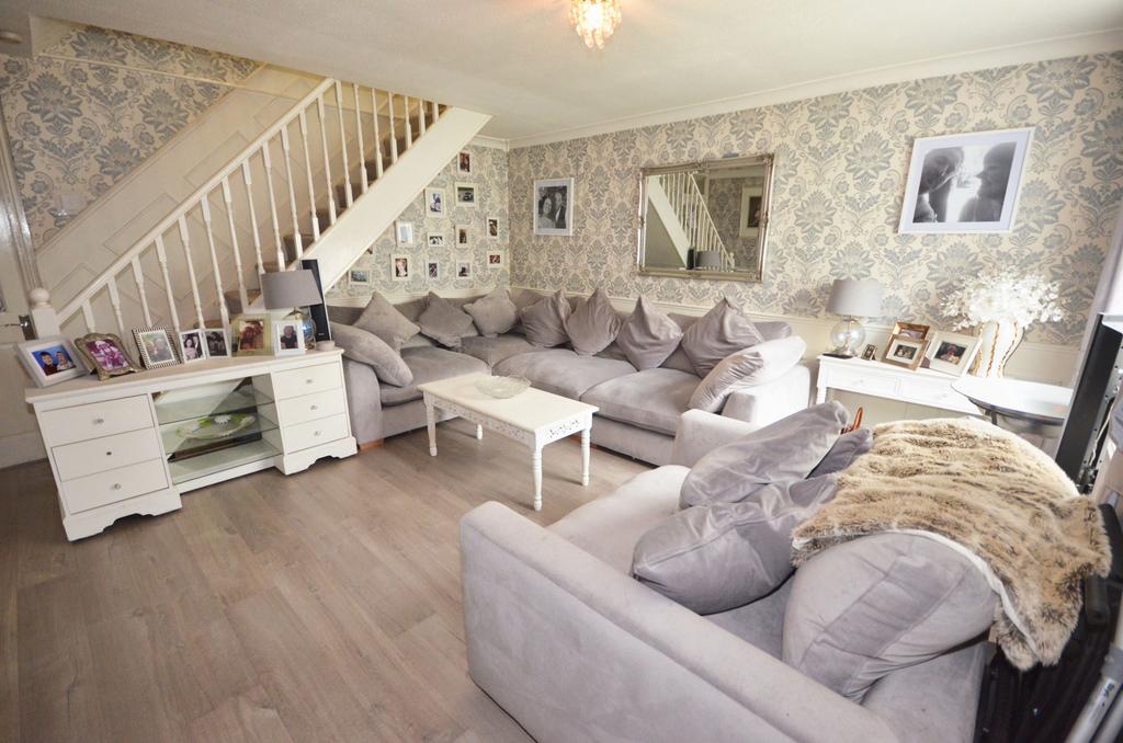 Double glazed window to front, part panel walls, laminate to flooring, ceiling light, freestanding electric fireplace, radiator, TV point, internet point, stairs rising to first floor.