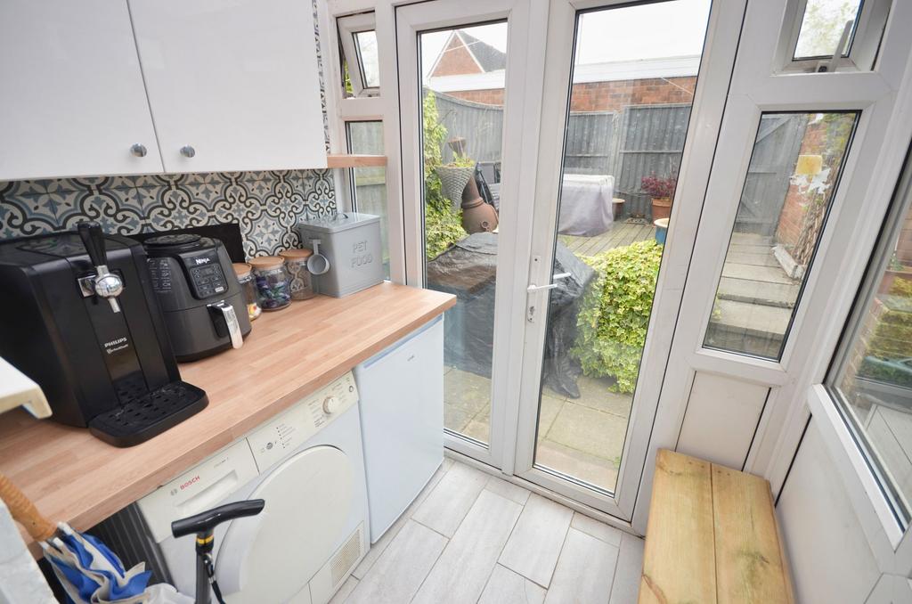 Conservatory style lean to, double glazed French doors opening onto garden, double glazed windows to rear & side, wall units, wood effect counter top, space for tumble dryer, space for under counter appliance, tiled flooring, cat flap.