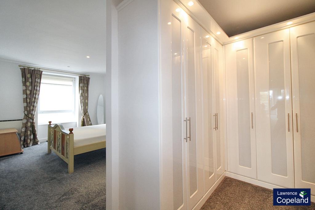 Bedroom Two measuring 16 ft 4 x 8 ft 6 into wardrobes (4.98m x 2.59m) with high specification built in wardrobes with white high gloss doors with inset dresser and vanity mirror.