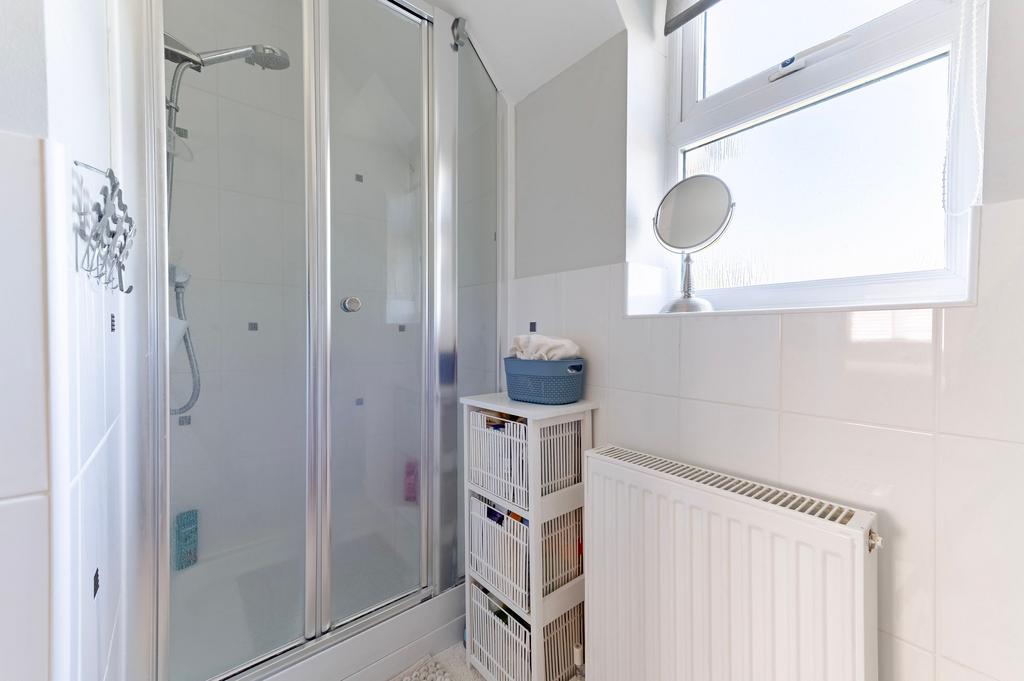 The family bathroom serves the remaining rooms and includes a fully tiled design, a panelled bath with a shower over, and a practical vanity unit with integrated basin storage.