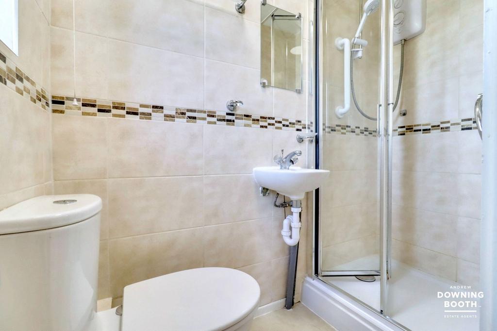 The en-suite shower room is fitted with a contemporary white suite, including a low level flush WC, wall mounted wash hand basin with chrome mixer tap, and a shower enclosure. The room is also fitted with a rear facing UPVC double glazed window, tiled walls and tile effect flooring.