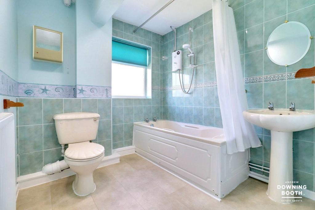 The family bathroom is fitted with a cream suite, including a low level flush WC, pedestal wash hand basin, and a bathtub with Mira shower over. There is also a rear facing UPVC double glazed window, radiator, partially tiled walls and tile effect flooring.