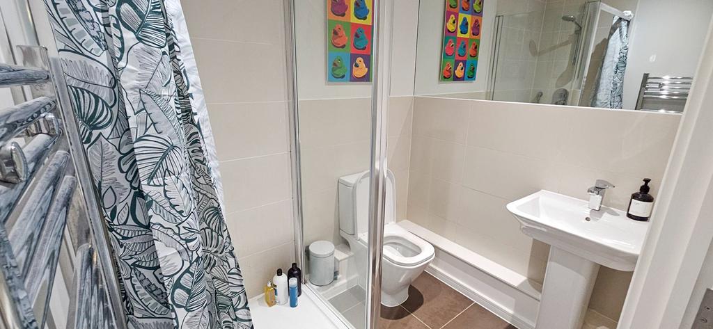 A three piece suite to comprise of a shower cubicle with a built in shower, low level W.C., pedestal wash hand basin, a wall mounted mirror, heated towel rail, shaver point, recessed down lights and tiled areas to the walls and floor.
