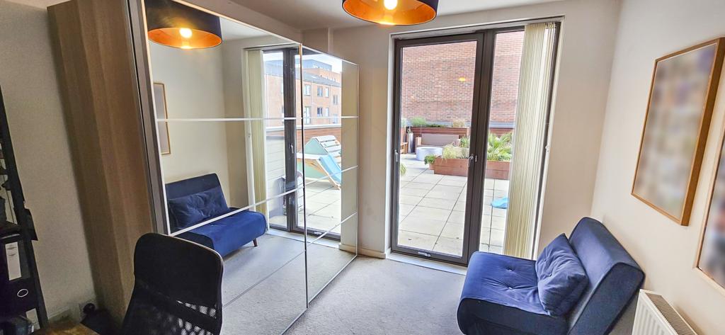A double glazed sealed unit window and tilt and turn double glazed sealed unit window/door to the roof terrace garden. A radiator and telephone point.