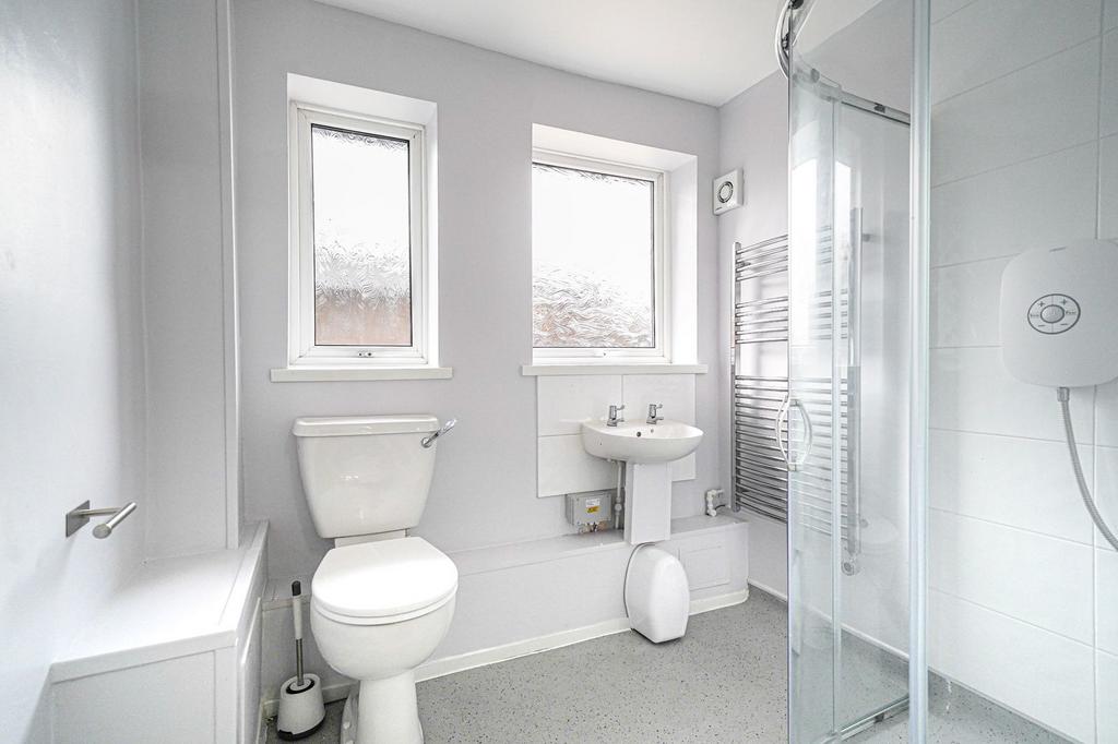 Having a corner shower cubicle with non-slip flooring, floor drain and electric shower over, low level flush toilet and wall mounted sink, tiling to water prone areas, non-slip flooring, newly installed heated towel radiator, ceiling light point and two obscure double glazed windows to the rear elevation