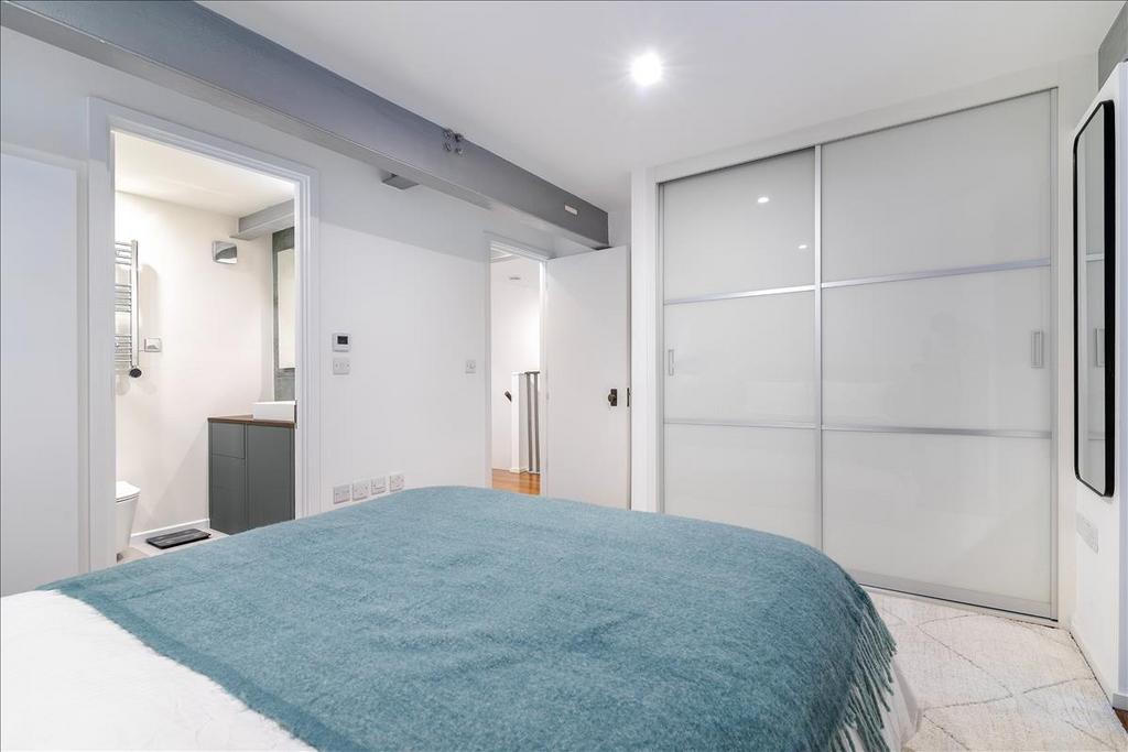 The upper level encompasses two spacious double bedrooms, with the primary bedroom benefiting from an en-suite shower room and a walk-in wardrobe. The en-suite is elegantly finished in monochrome tones, complete with a walk-in shower, a large basin sink with ample storage, a heated towel rail, and an anti-fog vanity mirror.
