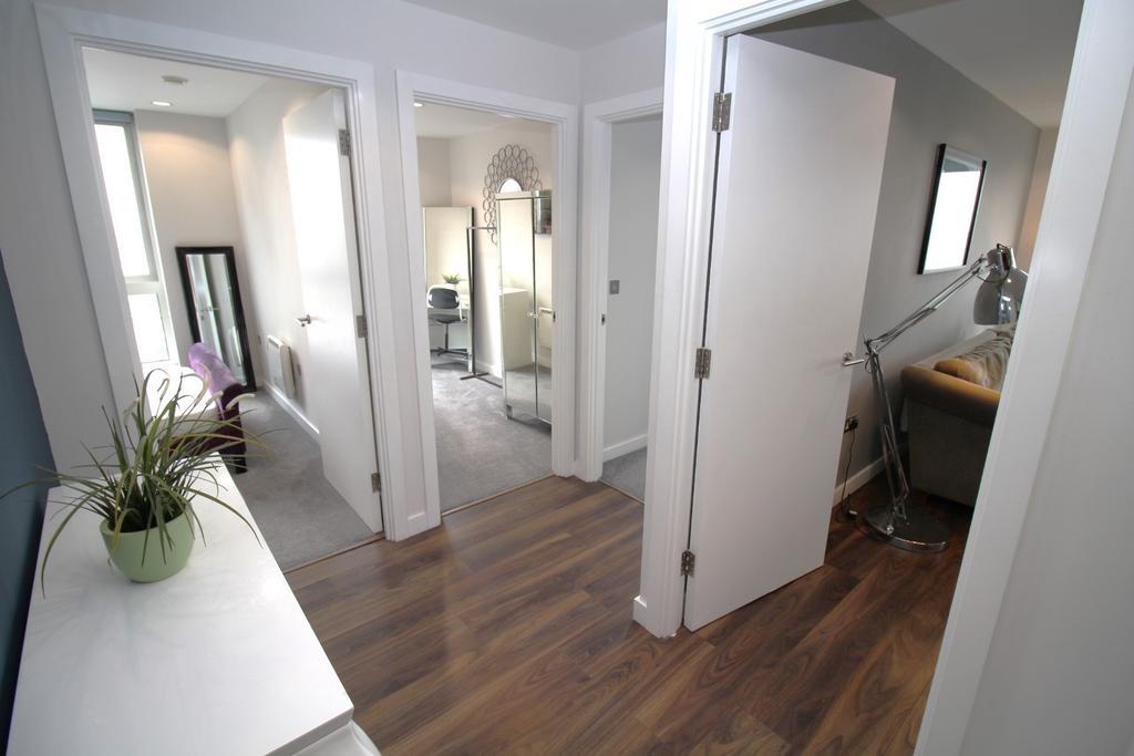 High end executive apartment with 2 bedrooms and 1 office/study room, 2 bathrooms & study/dressing room located on the 17th floor of The Heart, Media City, Salford. This luxury apartment is fully furnished to designer standards. Recently fully refurbished & let with deep pile carpet to all beds/study room & walnut wood flooring throughout reception, kitchen & main lounge. The apartment benefits from recent redecoration throughout in Farrow & Ball colours.