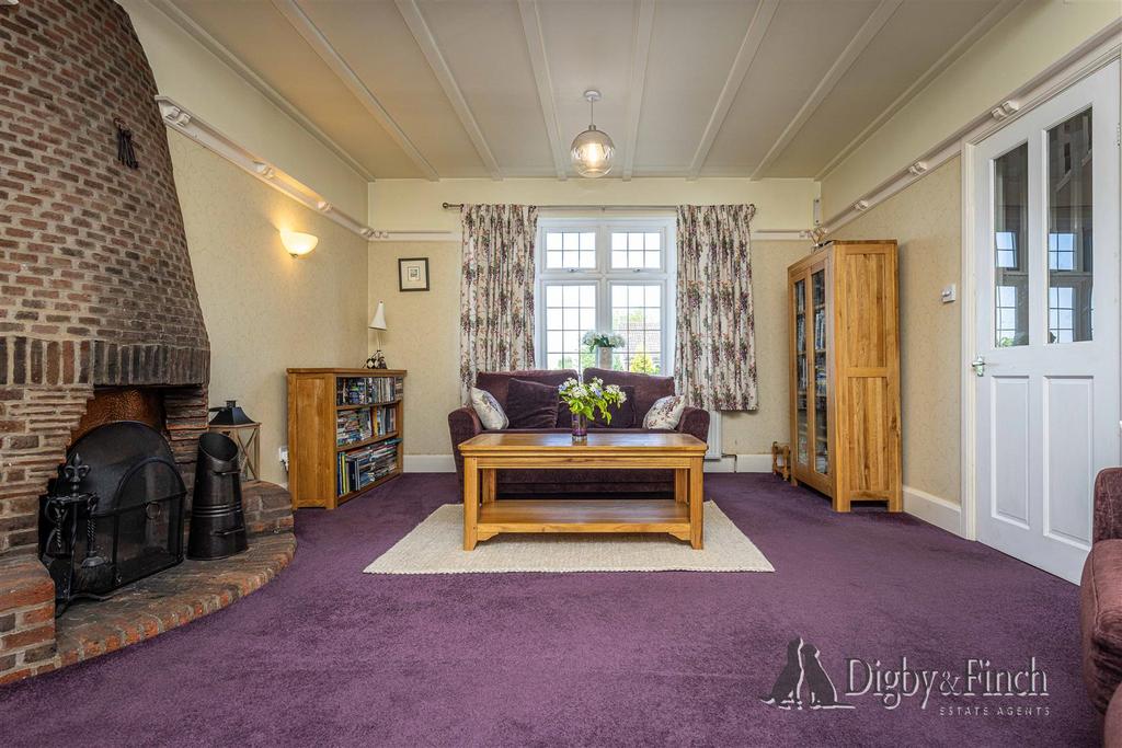 To the right of the house is the principal sitting room, a generous and cosy space carpeted for comfort and centred around a kiln-shaped exposed brick fireplace with an open fire. This room benefits from dual aspect windows to the front and rear, the latter opening into the garden room through double doors.