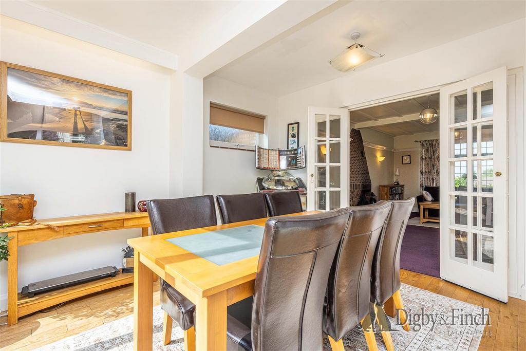 The garden room, currently serving as a dining room, is filled with natural light thanks to sliding patio doors that lead directly onto the rear terrace. Oak flooring continues the sense of quality and seamlessly connects this room with the garden beyond.