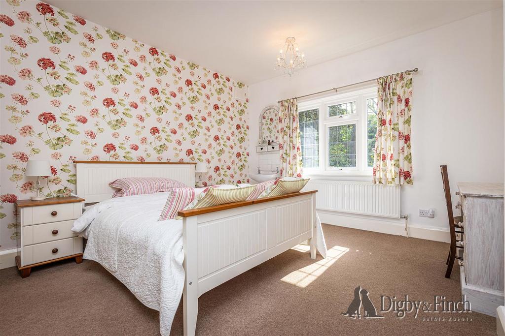 The principal bedroom sits centrally to the rear of the property and enjoys a lovely outlook over the garden through a wide bay window, mirroring the one below in the snug. Fitted furniture includes a full wall of wardrobes, bedside tables, and a broad dressing table that incorporates a built-in sink.
