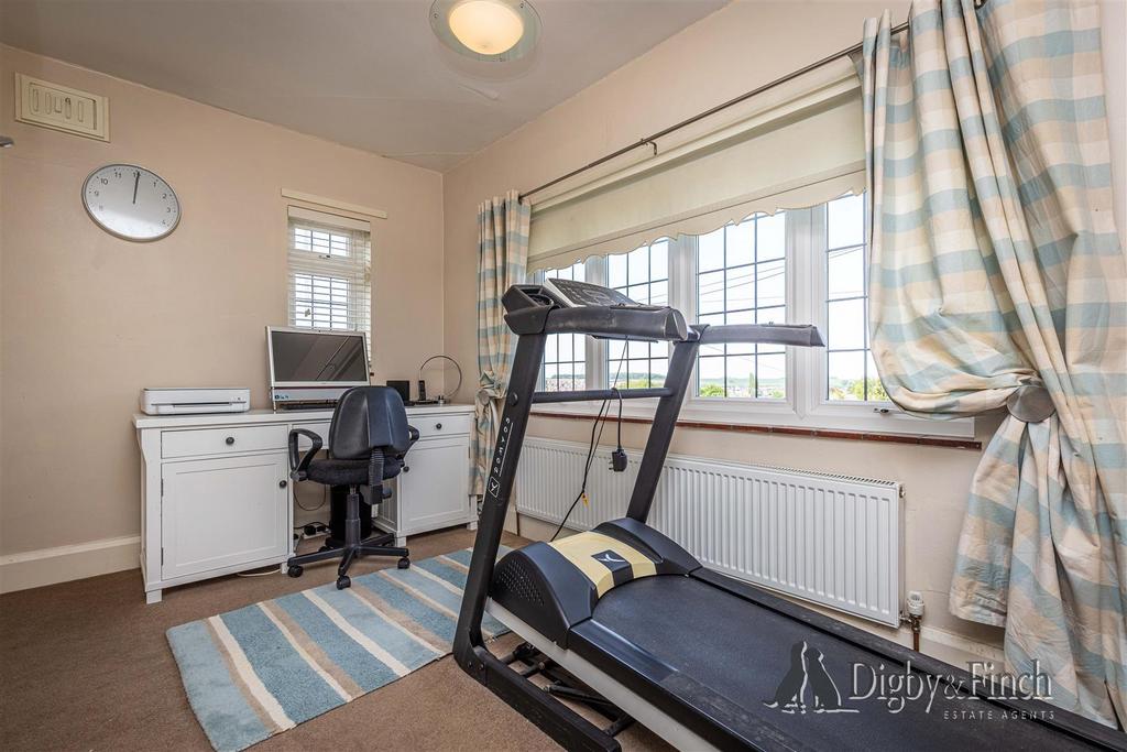 The fourth bedroom is a generous double currently used as a home office, with a wall of fitted shelved cabinets—ideal for working from home or for use as a guest room.