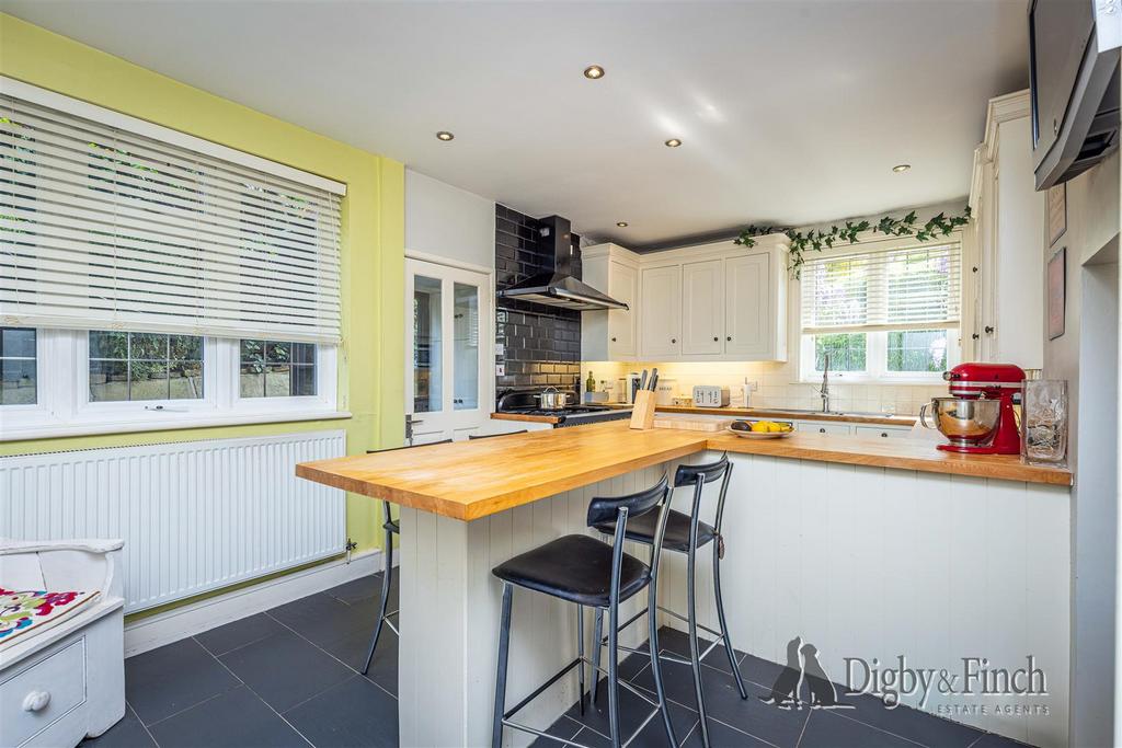 To the left of the hallway is the breakfast kitchen, which occupies the full depth of the property on this side. It features an extensive range of cream base and wall cabinetry paired with wood worktops, brushed chrome handles, and a striking black tiled floor. A central L-shaped breakfast bar comfortably seats four and is perfect for casual dining. Culinary enthusiasts will appreciate the Rangemaster Noir Classic 110 cooker, complete with a gloss black subway tile splashback and matching extractor fan. Additional fittings include undercounter space for a dishwasher, fridge and freezer, a microwave shelf, and a 1½ bowl stainless steel sink with a mixer spray tap. A door from the kitchen leads into a side porch with a storage cupboard and external access to a side courtyard—ideal for utility use or hanging laundry.